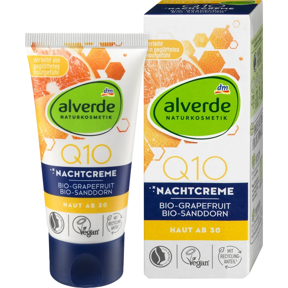 The Alverde Q10 Night Cream has a care formula of natural coenzyme Q10, organic grapefruit extract, organic sea buckthorn oil and organic acerola extract. It provides the skin with natural vitamin C. With precious macadamia nut oil and cocoa butter, it regenerates the skin overnight and leaves it feeling soft.