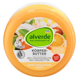 The Alverde Body Butter with orange blossom and organic shea butter with its high-quality care formula with organic macadamia nut, organic olive and organic soybean oil and organic shea butter gives your skin rich care and long-lasting protection.