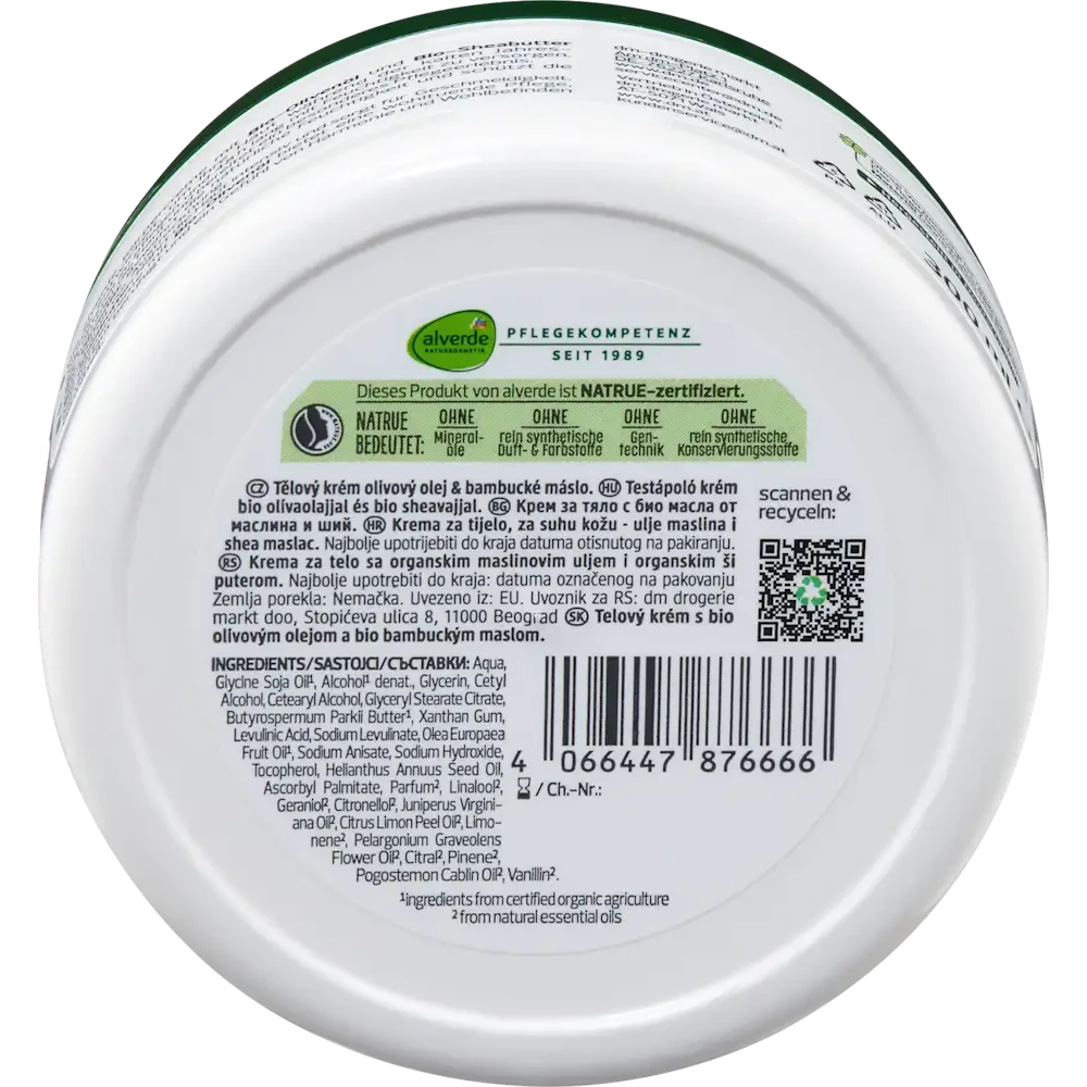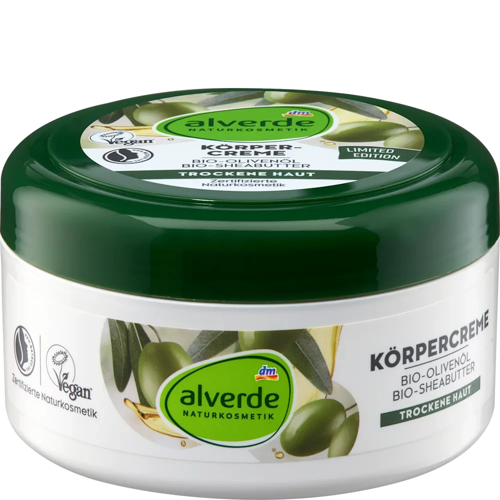alverde Bodycream Olive Oil & Sheabutter is a vegan natural body cream crafted to deliver intensive moisture and protection for dry skin with a rich yet absorbent texture. The formula harnesses the nourishing properties of organic olive oil and organic shea butter, offering up to 48 hours of hydration while guarding against dryness and environmental stress, making it ideal for daily body care, especially in colder seasons.