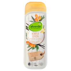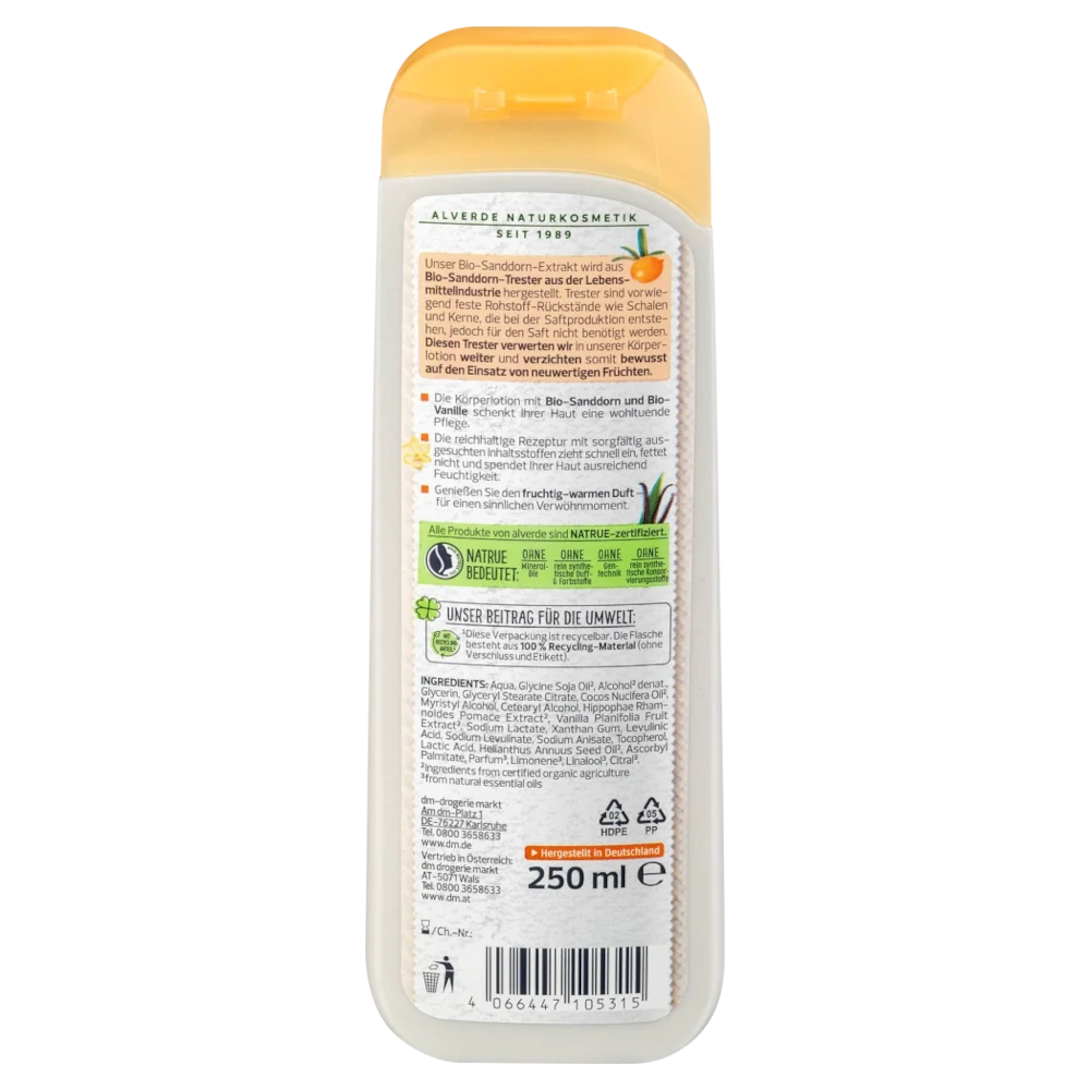 The organic sea buckthorn extract of the Alverde Body Lotion Organic Sea Buckthorn & Organic Vanilla is made from organic sea buckthorn pomace from the food industry. Pomace is mainly solid raw material residues such as peels and seeds that are produced during juice production, but are not needed for the juice. The use of pomace deliberately avoids the use of virgin fruit. The body lotion gives your skin a soothing care, absorbs quickly, is not greasy and moisturizes. In addition, enjoy the fruity-warm scent.