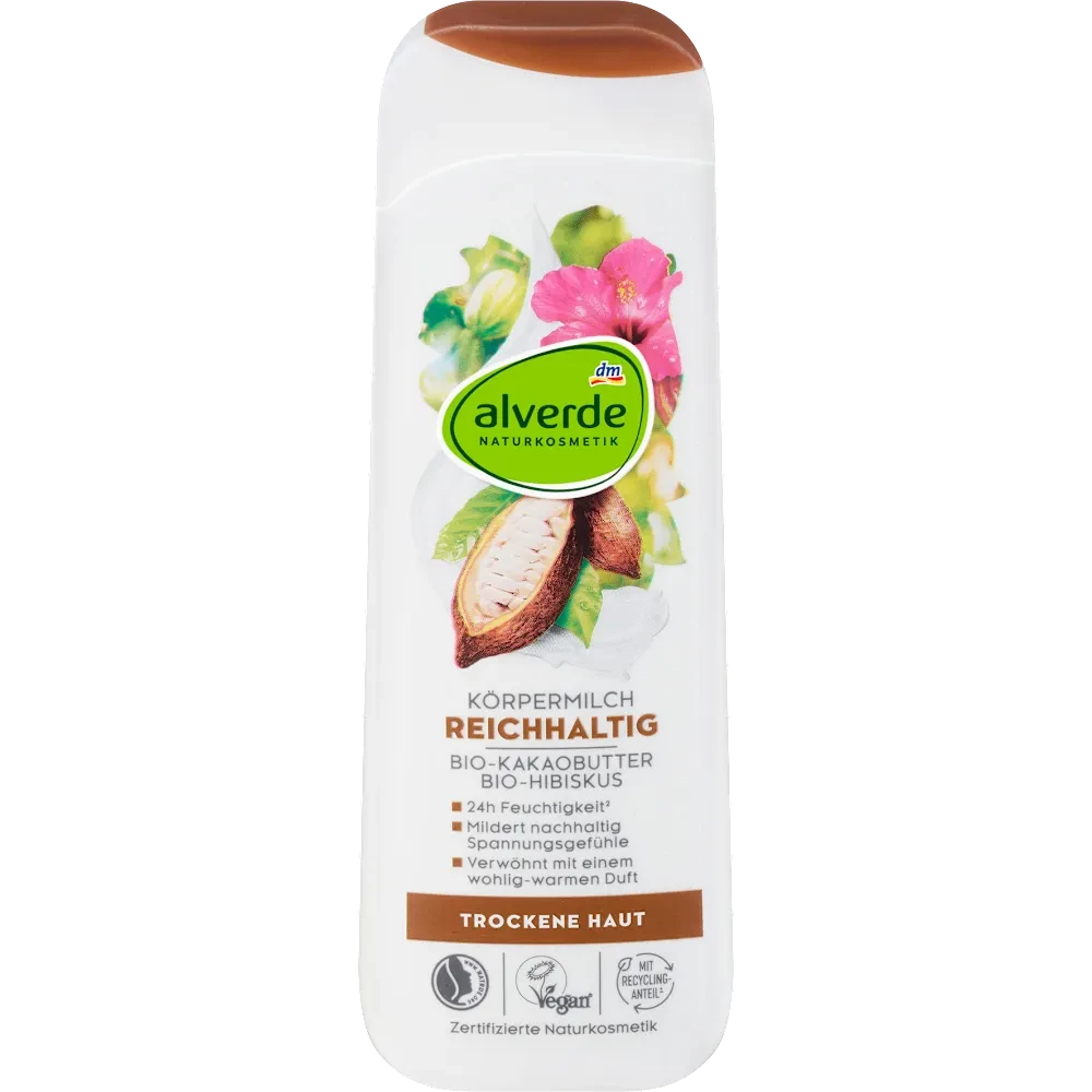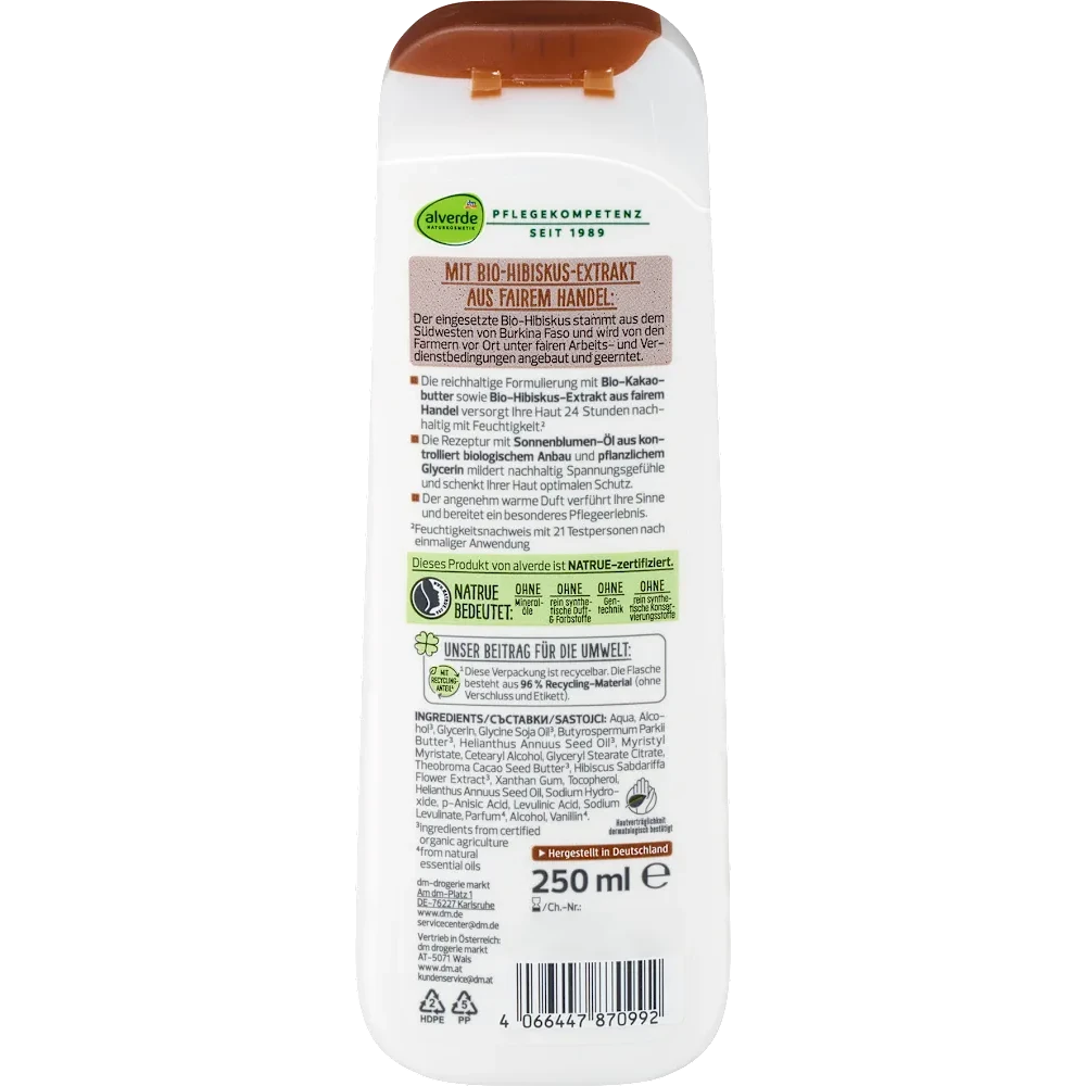 Alverde Body Milk Cocoa Butter & Hibiscus is based on a rich formulation with organic cocoa butter and organic hibiscus extract from fair trade. The body milk provides your skin with 24 hours of lasting moisture. In addition, the formula with sunflower oil from certified organic cultivation and vegetable glycerin sustainably reduces feelings of tension and gives your skin optimal protection. The pleasantly warm fragrance seduces your senses and provides a special care experience.