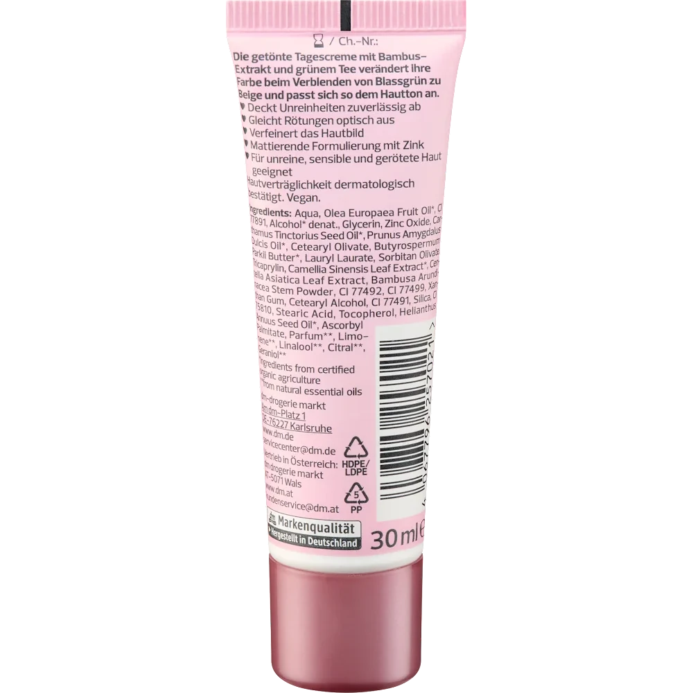 alverde’s Clear Beauty Tinted Day Cream is a lightweight BB-style moisturizer that transforms from pale green to a subtle beige tone once blended, seamlessly adapting to your skin. It offers reliable coverage for imperfections, camouflages redness, and visibly refines the complexion with a soft-focus effect.