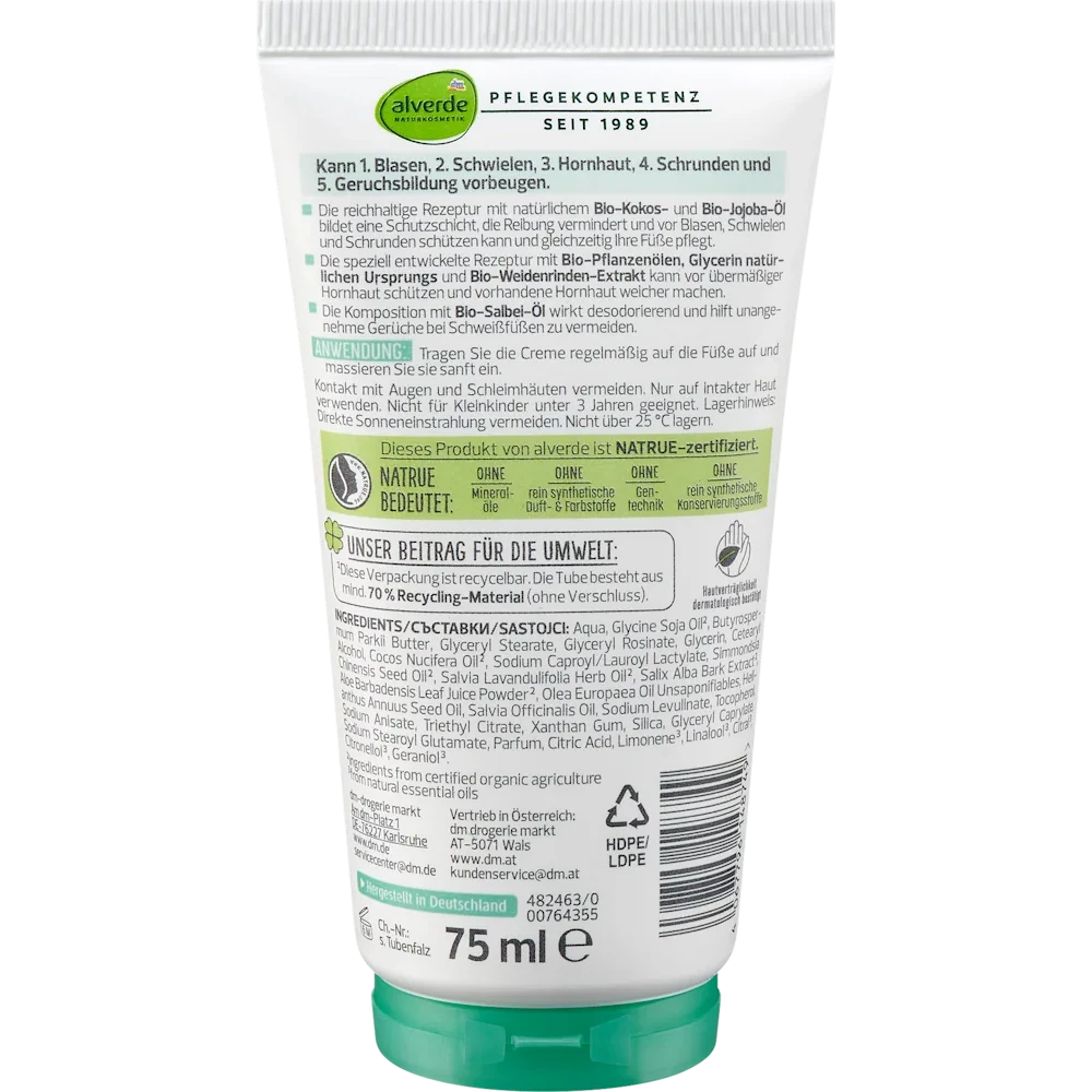 The 5-in-1 foot cream with organic sage and organic willow bark from alverde NATURKOSMETIK offers comprehensive care for your feet. Thanks to its rich formula with natural organic coconut and organic jojoba oil, it forms a protective layer that reduces friction and effectively protects against blisters, calluses, and cracked skin. The specially developed formula contains organic plant oils, naturally sourced glycerin, and organic willow bark extract, which help prevent excessive calluses and soften existing calluses. In addition, the organic sage oil has a deodorizing effect and helps reduce unpleasant odors caused by sweaty feet. An ideal product for well-groomed and protected feet.