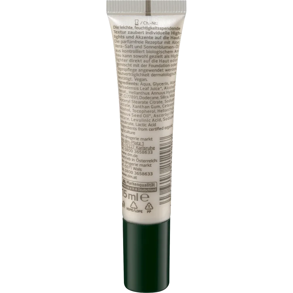 Achieve a radiant, dewy glow with the alverde NATURKOSMETIK Highlighter Liquid. This lightweight, hydrating formula is enriched with Aloe Vera Juice and Sunflower Seed Oil from certified organic farming, providing a luminous finish without compromising skin health.