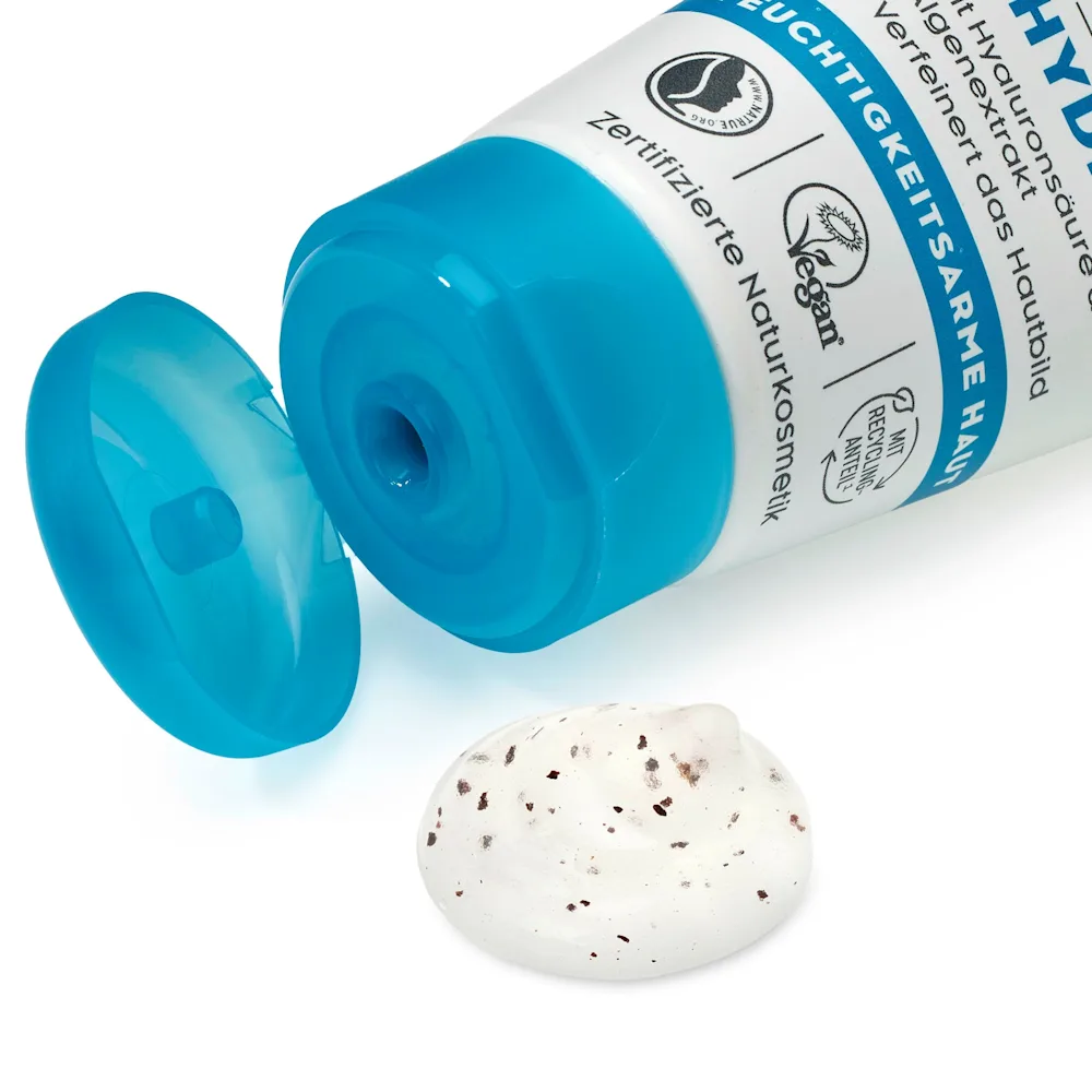 Natural facial exfoliant made in Germany, ideal for dehydrated skin. This formula combines certified organic aloe vera, hyaluronic acid (sodium hyaluronate) and marine algae extract to provide moisture while gently removing dead skin cells. Fine grape seed particles deliver mild exfoliation without microplastics.