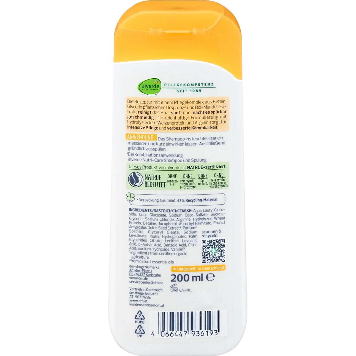 This shampoo is developed for dry and stressed hair, offering mild cleansing combined with plant-based care. Sugar-derived surfactants gently remove impurities without overly stripping the hair. Almond extract and plant oils contribute to a smoother hair surface, while Arginine supports the hair structure. The formula helps maintain softness and improves manageability during regular washing. As part of NATRUE-certified natural cosmetics, it follows defined standards for natural formulations.