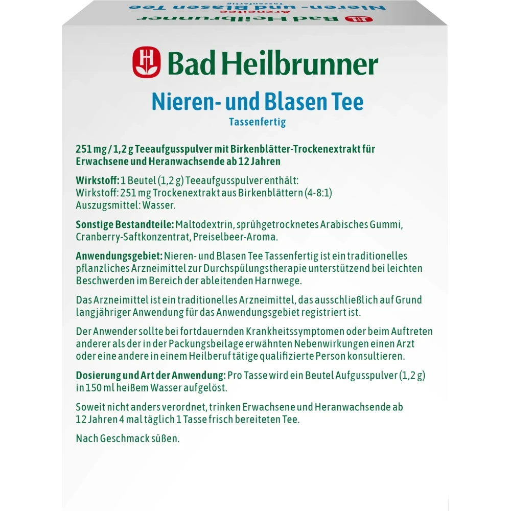 Kidney and Bladder Tea ready to drink is a traditional herbal medicinal product for flushing therapy to support mild complaints in the area of the urinary tract. The medicinal product is a traditional medicinal product which has been registered for this area of application exclusively on the basis of many years of use.