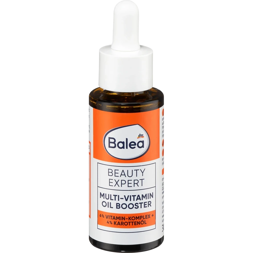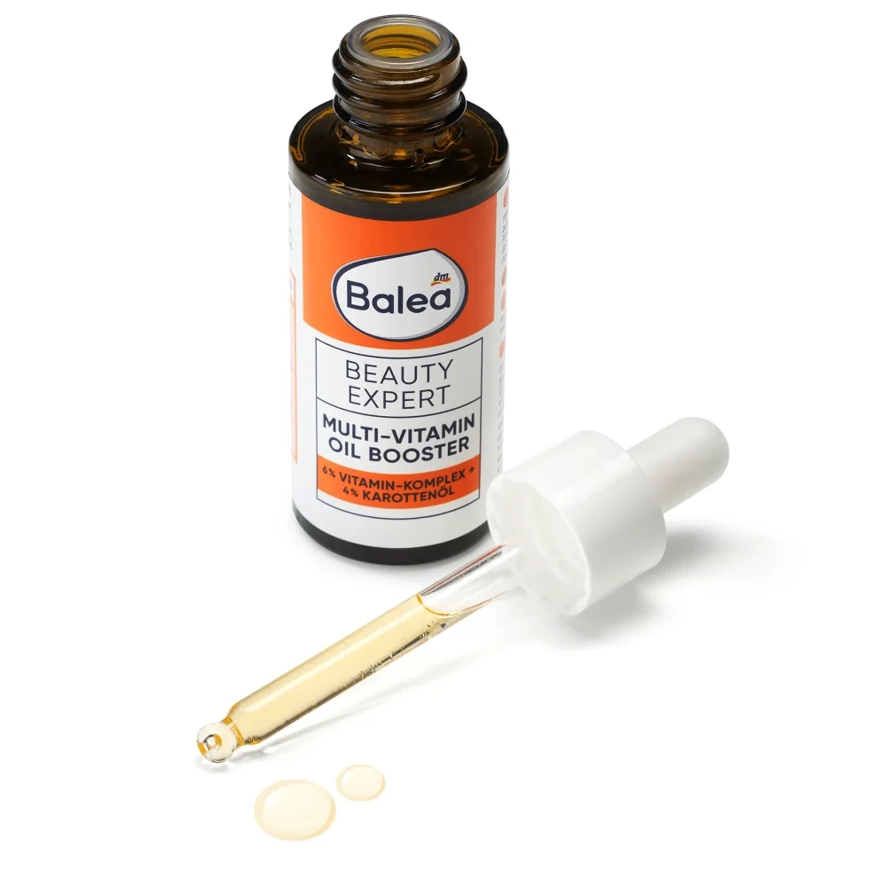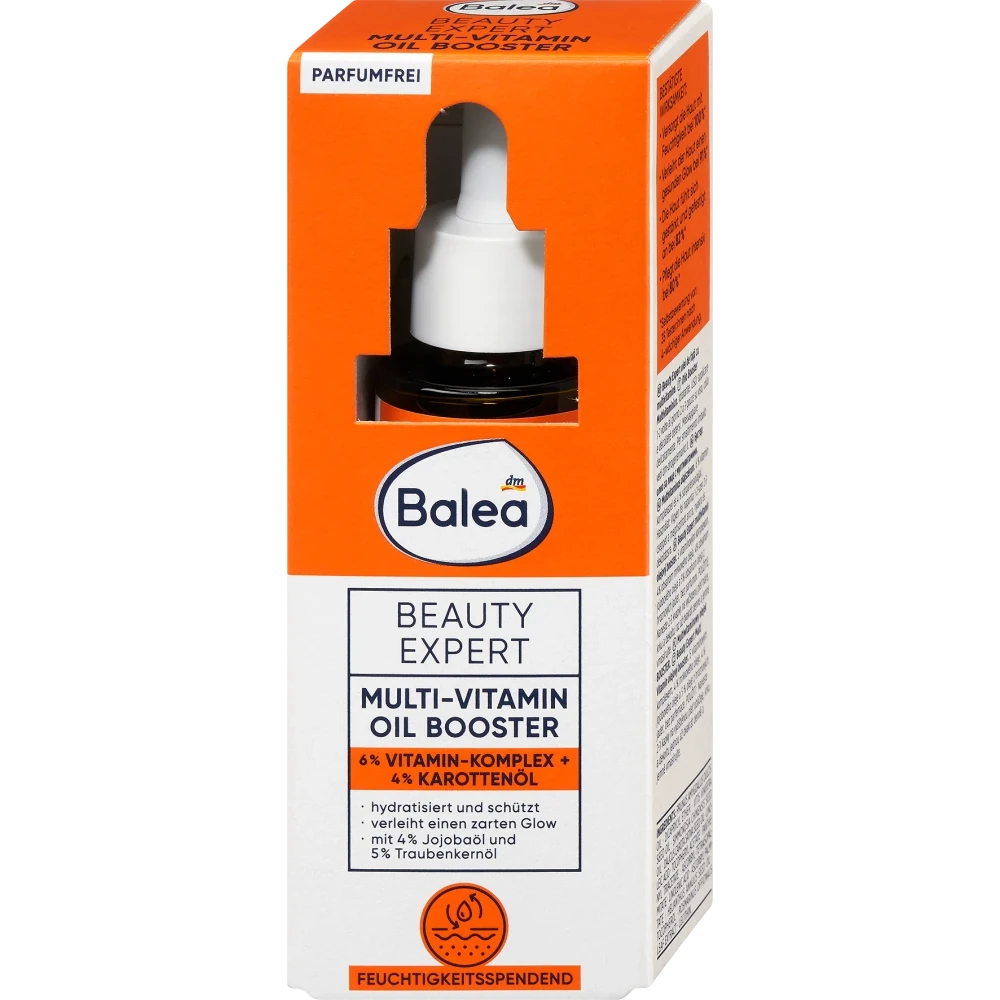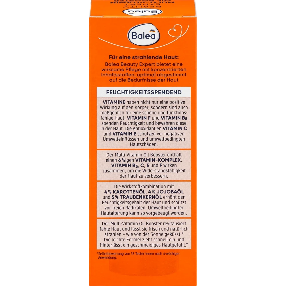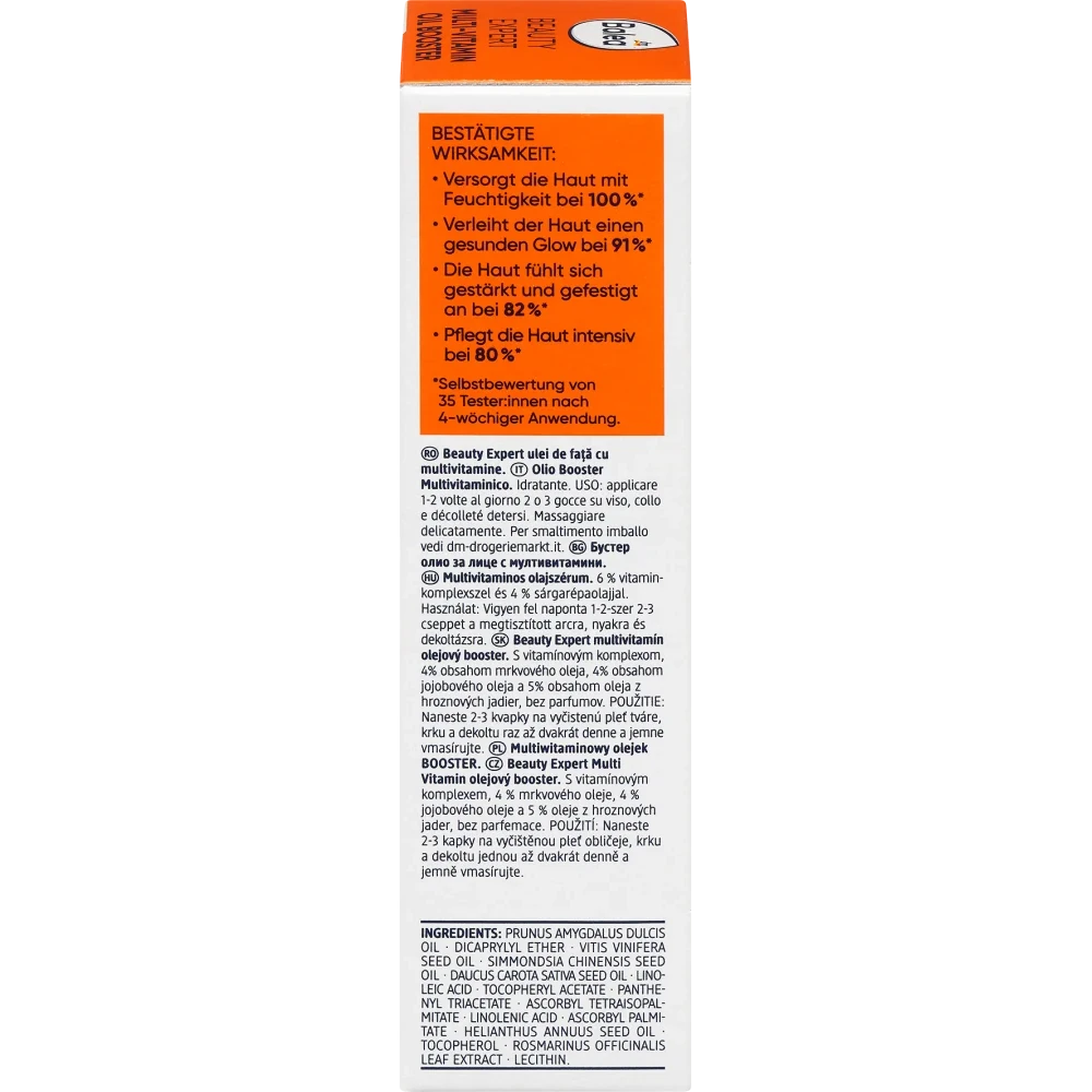 VITAMINS not only have a positive effect on the body, but are also essential for beautiful and functional skin. VITAMIN F and VITAMIN B5 moisturize and retain moisture in the skin. The antioxidants VITAMIN C and VITAMIN E protect against negative environmental influences and environmentally-induced skin damage. The Multi-Vitamin Oil Booster contains a 6% VITAMIN COMPLEX. VITAMIN B5, C, E and F work together to improve the skin’s resistance. The combination of active ingredients with 4% CARROT OIL, 4% JOJOBA OIL and 5% GRAPE SEED OIL increases the skin’s moisture content and protects against free radicals. Environmental skin ageing can thus be prevented. The multi-vitamin oil booster revitalizes dull skin and leaves it fresh and naturally radiant – as if kissed by the sun.* The light formula is quickly absorbed and leaves the skin feeling supple.*
