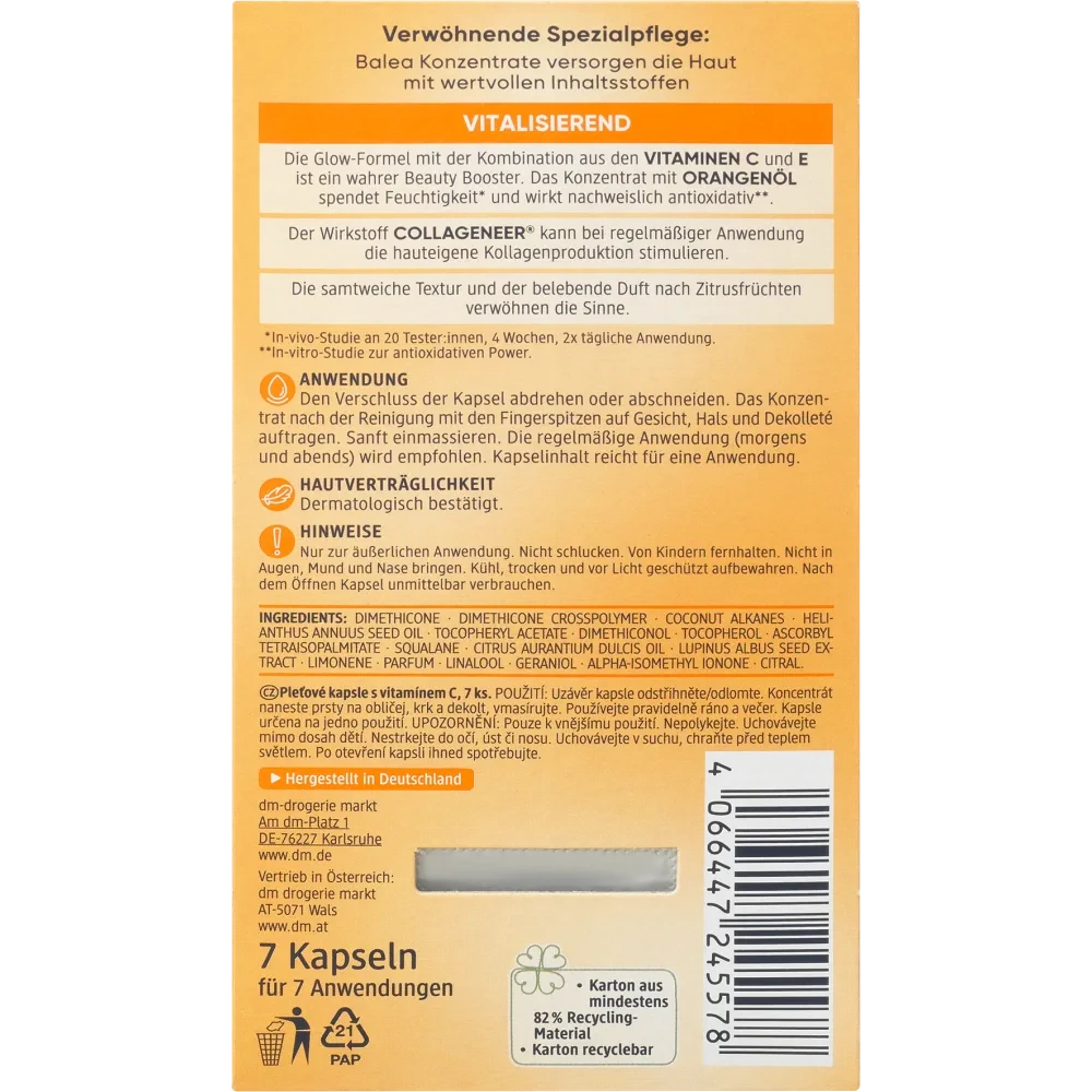Protection meets intensive care: This concentrate is enriched with Vitamin E and Squalane to strengthen the skin’s moisture barrier and protect against oxidative stress. The inclusion of Lupinus Albus Seed Extract helps to improve skin elasticity, while the silky texture absorbs instantly. The Balea Concentrate Vitamin C is the perfect addition to your morning routine to shield your skin from environmental influences throughout the day.