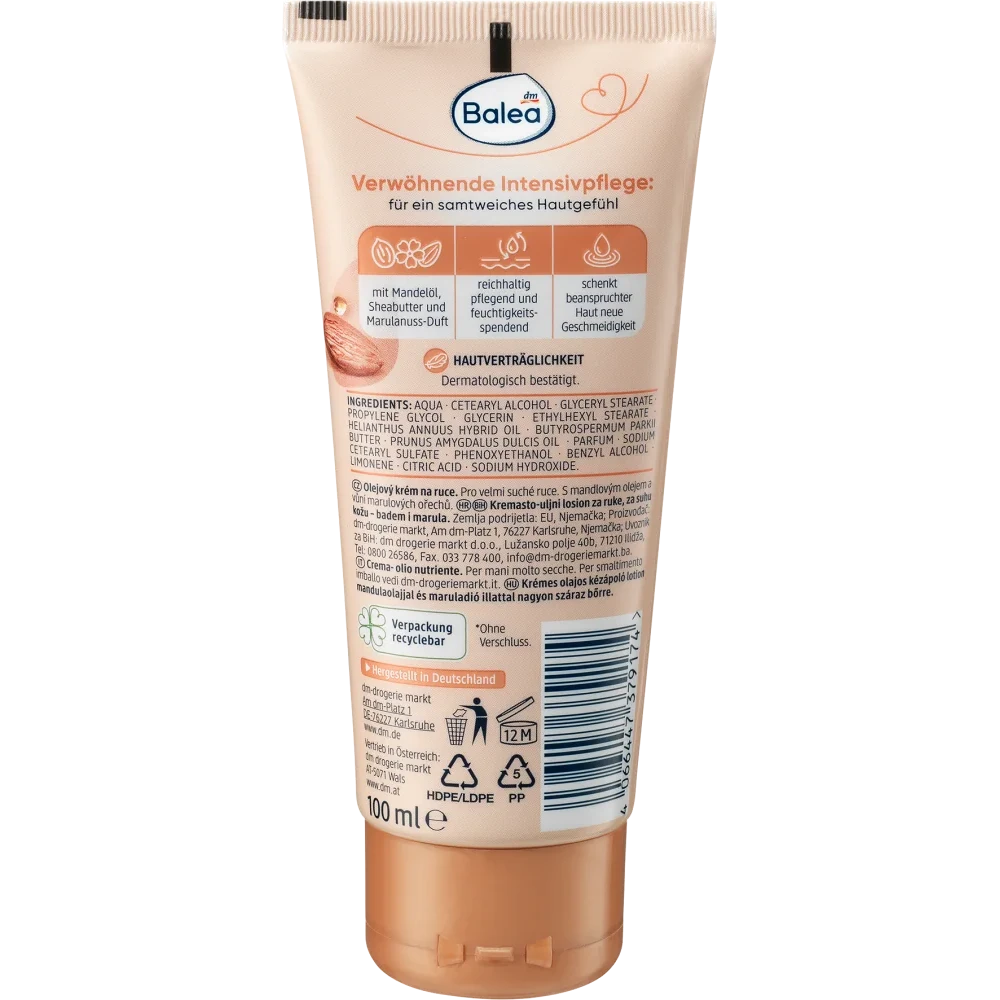 The Balea cream-oil hand lotion is perfect for very dry hands. The pampering formulation with almond oil, shea butter and marul nut fragrance leaves the skin feeling velvety soft. The rich care gives stressed skin new suppleness. Formulated without microplastics and water-soluble, purely synthetic polymers.
