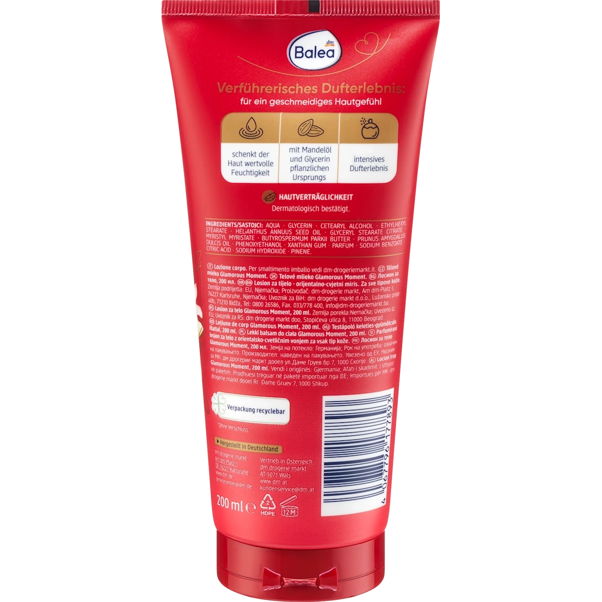 The Balea Glamorous Moment Perfume Body Lotion pampers the skin with an elegant oriental-floral fragrance while delivering nourishing daily body care. Its smooth, lightweight texture spreads easily over the skin and provides lasting moisture, leaving the skin feeling soft, supple and comfortably hydrated.