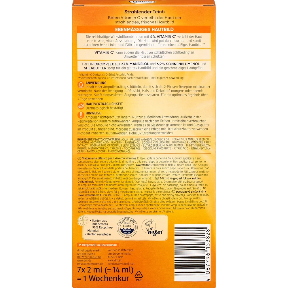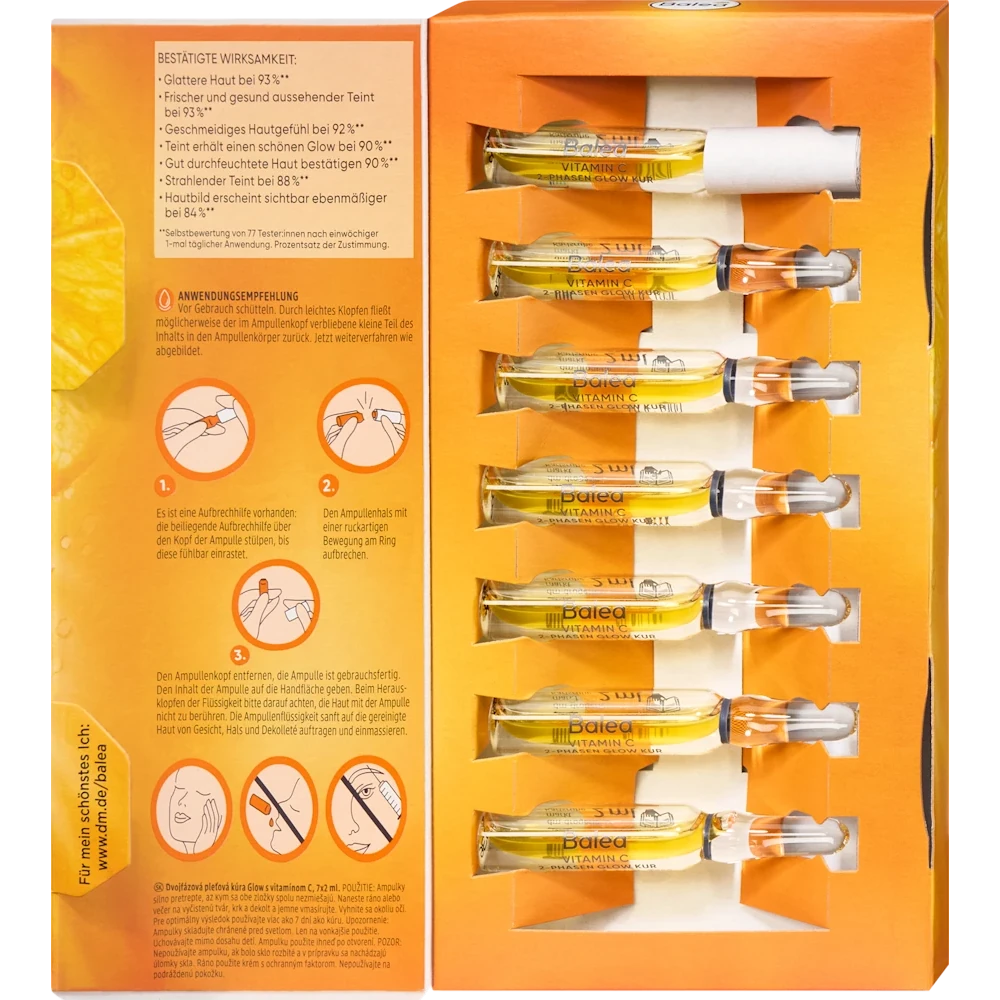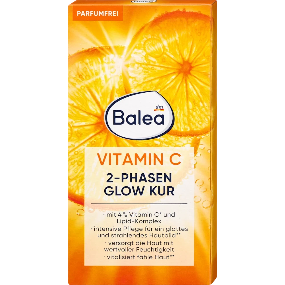Balea Glow Ampoules with 2-Phase Vitamin C deliver intensive hydration and a revitalizing effect. The formula contains 4% vitamin C and a lipid complex with 23% almond oil and 6.9% sunflower oil to support a smooth, radiant complexion. Fragrance-free and dermatologically tested, the ampoules are suitable for all skin types. The skin appears refreshed, and fine lines are visibly reduced.