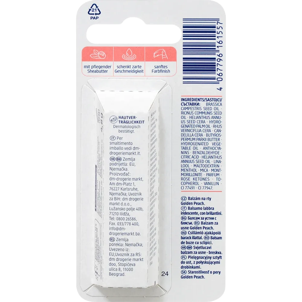 Balea Golden Peach Lip Balm provides reliable care for dry and sensitive lips. The formula is based on natural oils and waxes, including shea butter, sunflower oil, and candelilla wax. It delivers lasting moisture and protection without the use of mineral oils or parabens.