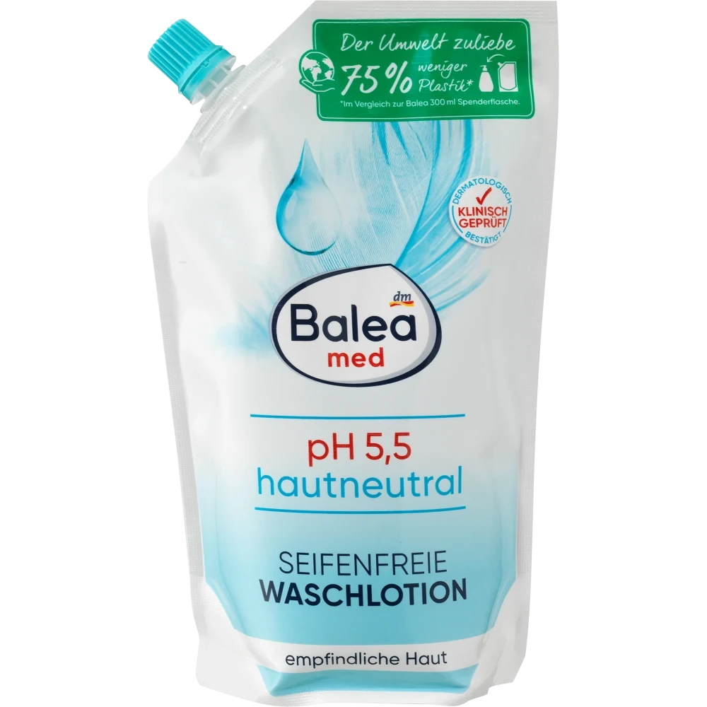 The soap-free wash lotion from Balea Med in a refill bag is a special care product for sensitive skin. The pH value of 5.5 corresponds to the natural pH value of the acid mantle of healthy skin. The soap-free wash lotion gently cleanses the skin without irritating or drying it out. The moisturizing formula with allantoin and a mild sugar surfactant is the perfect ingredient for gentle daily cleansing.
