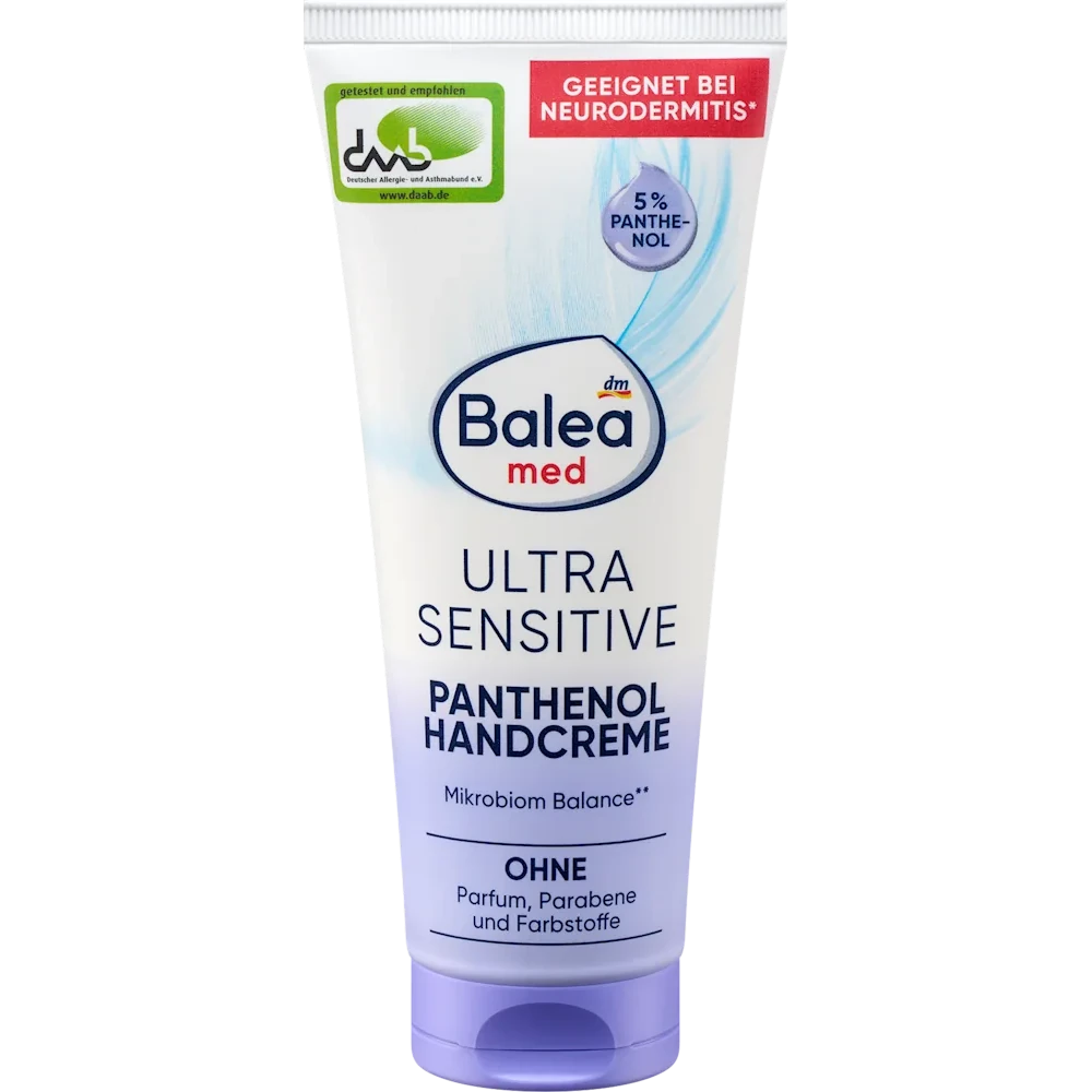 The Balea MED Ultra Sensitive Hand Cream is formulated specifically for delicate, sensitive, or irritated hands. It contains 5 % panthenol, glycerin, allantoin, and other skin‐conditioning agents that help soothe dryness and calm discomfort. The gentle formula supports the skin’s natural barrier without relying on fragrance, colorants, parabens, or mineral oils.