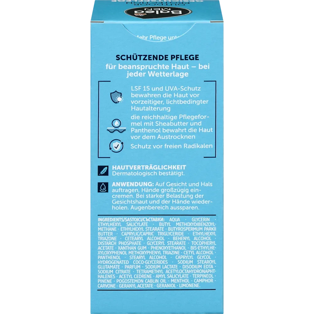 Balea MEN Outdoor Protection Face Cream LSF 15 is a vegan men’s face cream with SPF 15 designed for outdoor exposure and everyday environmental stress. It combines moisture support with light sun protection (LSF 15 & UVA filters) to help shield skin from drying effects of sun, wind and weather while delivering hydration through a practical, everyday formula. Its alcohol‑free, paraffin/mineral‑oil‑free and paraben‑free composition aligns with basic men’s grooming expectations.