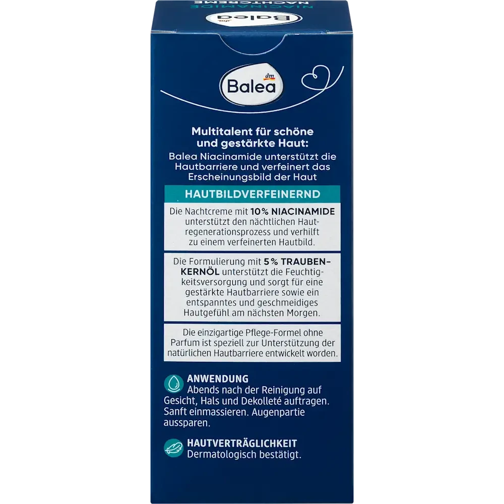 The Balea Niacinamide Night Cream is an intensive night cream formulated to refine pores and support your skin’s natural regeneration while you sleep. It contains 10% niacinamide and 5% grape seed oil, two powerful ingredients that work in concert to calm, moisturize, and smooth skin texture overnight.
