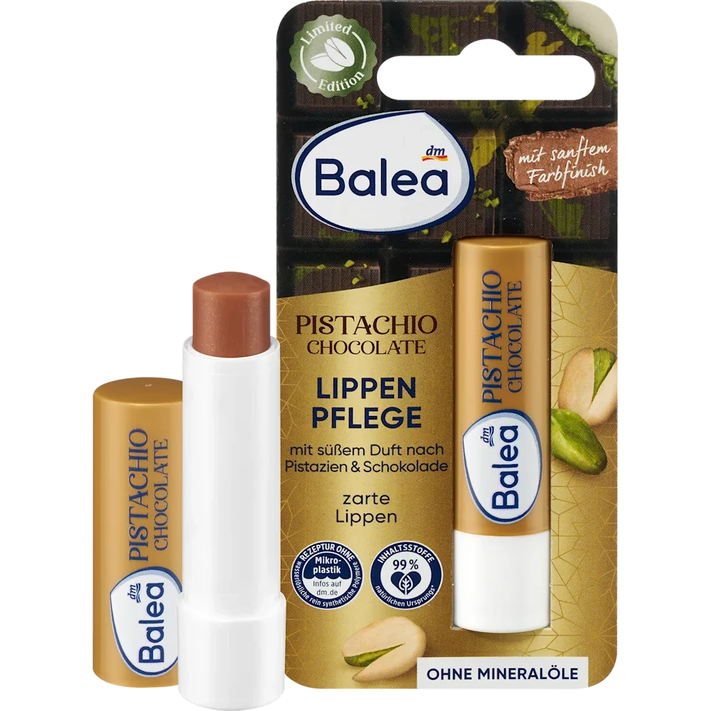 Balea Pistachio Chocolate Lip Balm combines effective lip care with a light, glossy finish. The formula with cocoa butter and shea butter nourishes dry lips and leaves them feeling soft and smooth. The subtle pistachio and chocolate scent adds a gentle sensory note. Ideal for daily use.