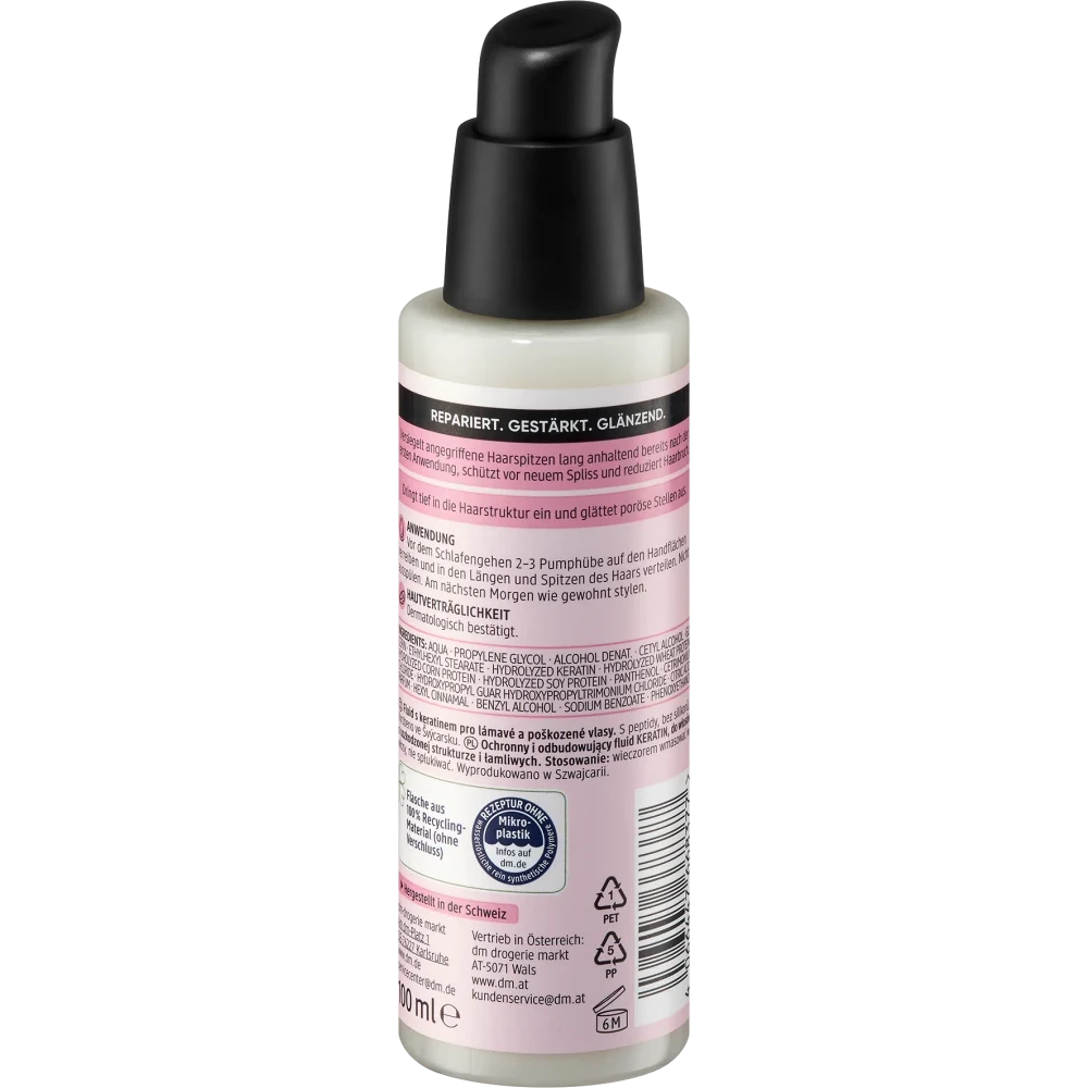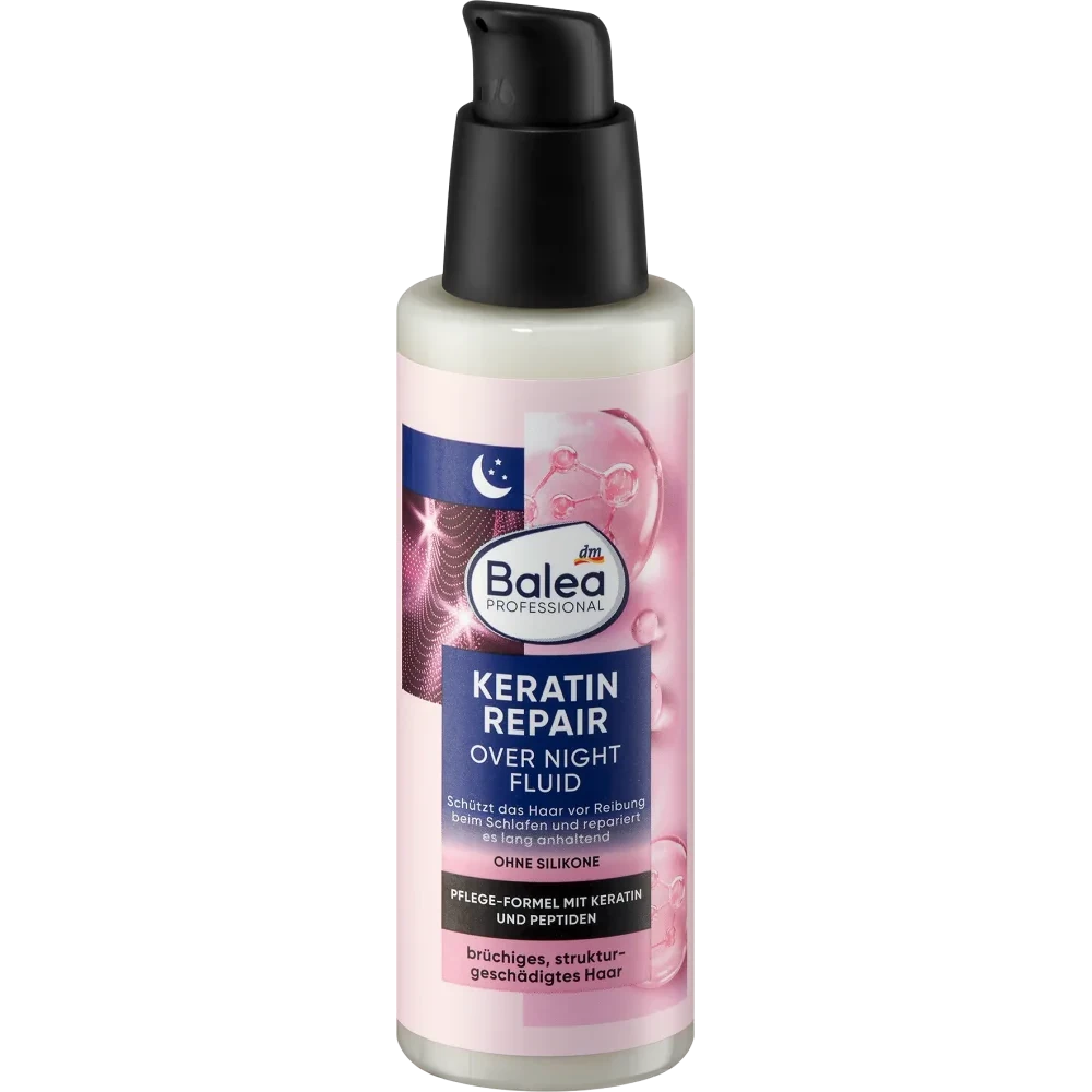 The Keratin Repair Over Night Hair Fluid from Balea Professional protects the hair from friction during sleep. The care formula with keratin and peptides seals damaged hair ends for a long time after the first application, protects against new split ends and reduces hair breakage. The fluid penetrates deep into the hair structure and smoothes out porous areas.