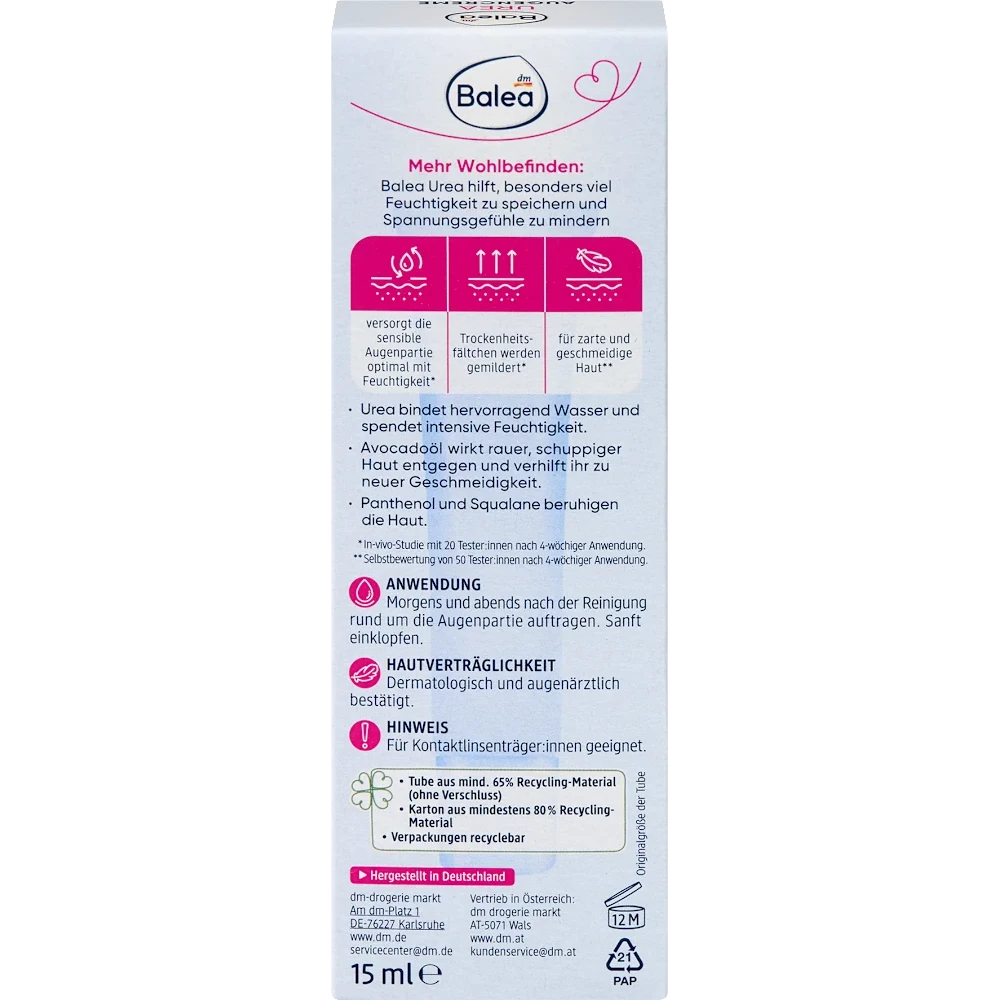 Balea Urea Eye Cream is a vegan, fragrance-free eye cream formulated to deliver targeted moisture to very dry and sensitive skin around the eyes. The blend of high-concentration humectants and lipid-rich support ingredients prioritises hydration with a simple, skin-compatible composition that avoids unnecessary additives, aligning with basic sensitive care expectations.