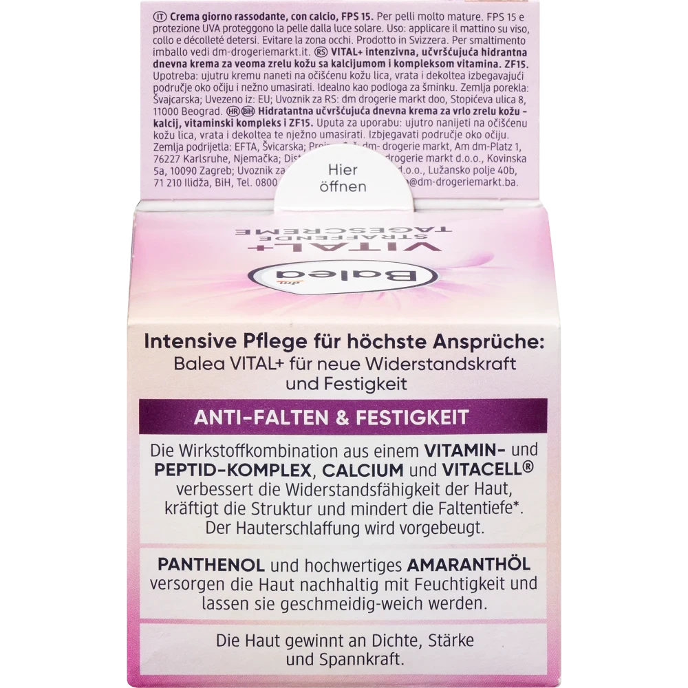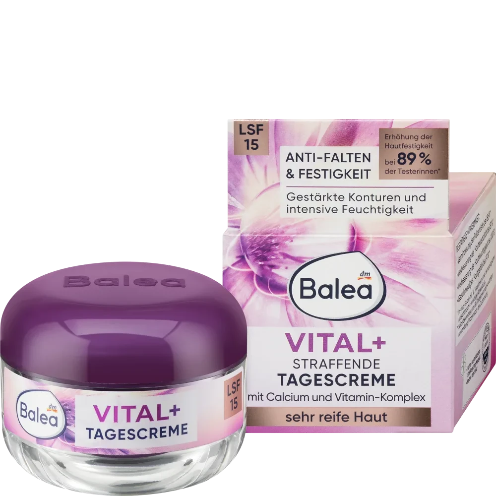 Balea Vital Plus Firming Day Cream provides your skin with high-quality ingredients. It gains density, strength and tone. The care formula with peptide complex, calcium, vitamin complex and VitaCell improves the resistance of your skin, strengthens the structure and reduces the depth of wrinkles. Panthenol and high-quality amaranth oil provide the skin with lasting moisture and leave it supple and soft. SPF 15 and UVA protection protect the skin from premature light-induced skin aging.