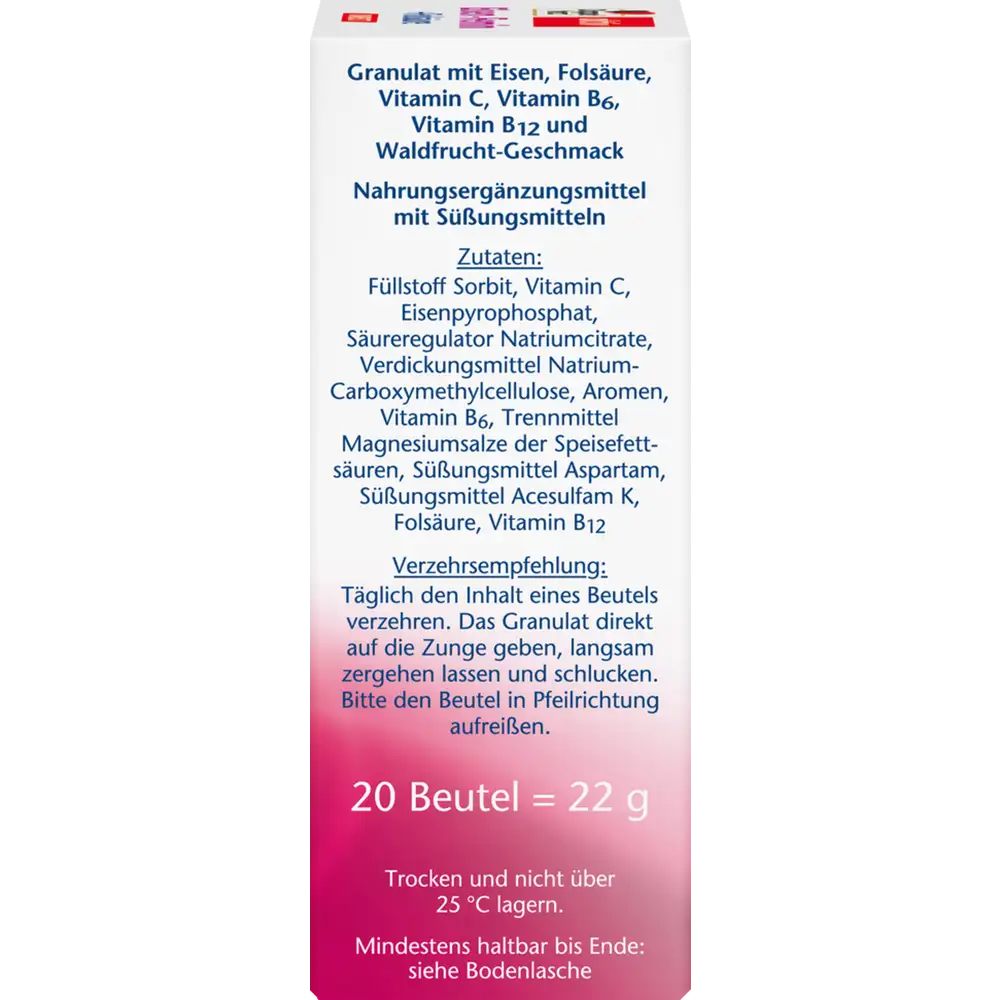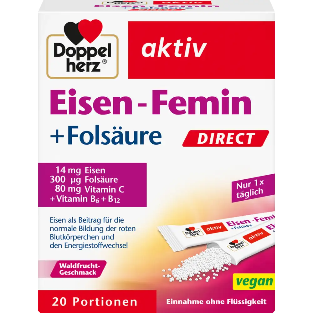 Doppelherz activ Iron-Femin DIRECT is a convenient iron supplement designed to support women’s health with a specially-formulated blend of key nutrients. It provides 14 mg of iron, along with 300 µg folic acid, 80 mg vitamin C, and important B-vitamins (B6 & B12) in each sachet.