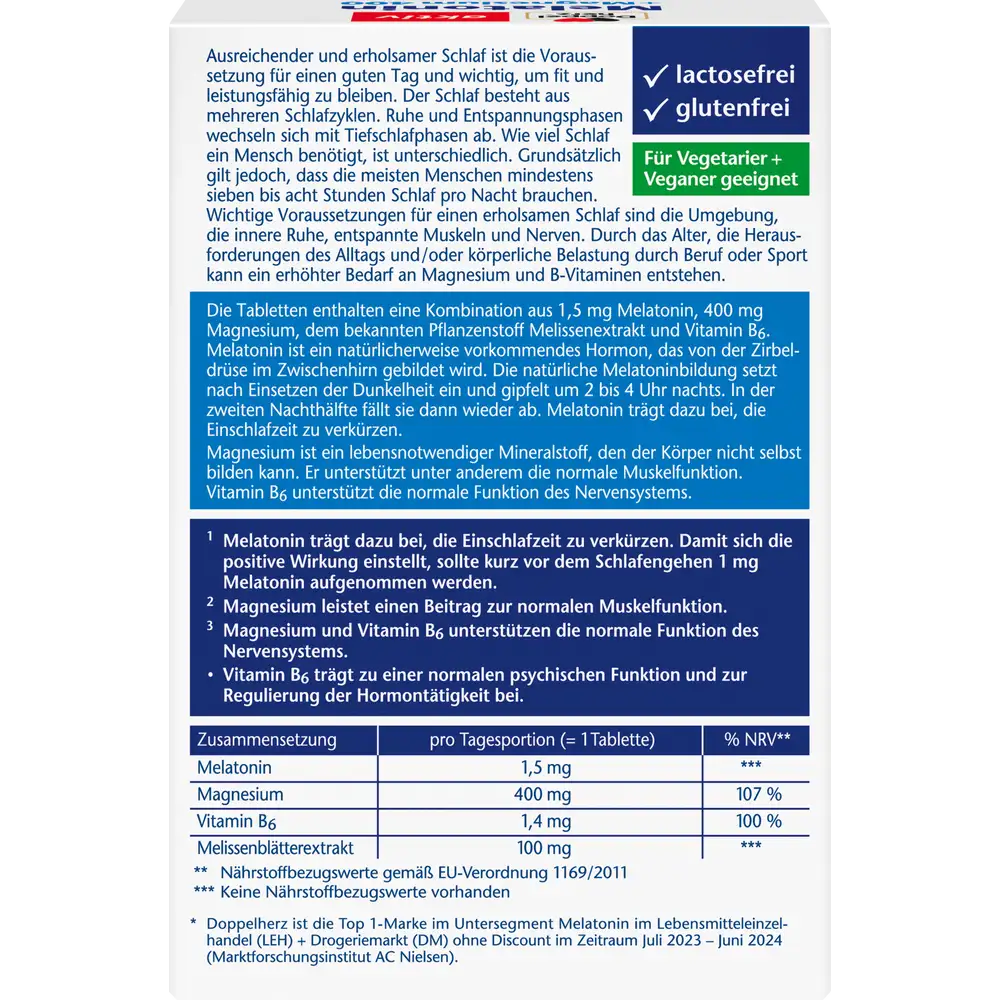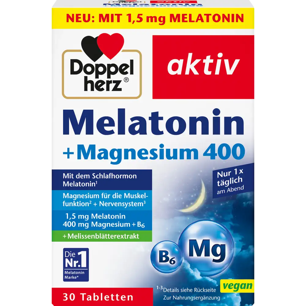 Doppelherz aktiv Melatonin + Magnesium 400 is a dietary supplement designed to support natural sleep and promote normal muscle function. The combination of melatonin, magnesium, vitamin B6, and lemon balm extract helps promote a calm and relaxed state, supports the nervous system, and contributes to overall restful sleep.