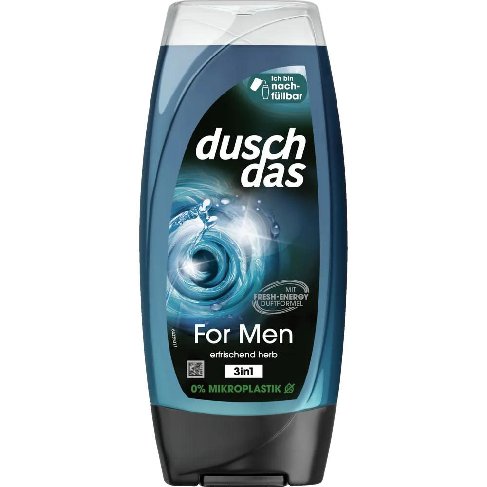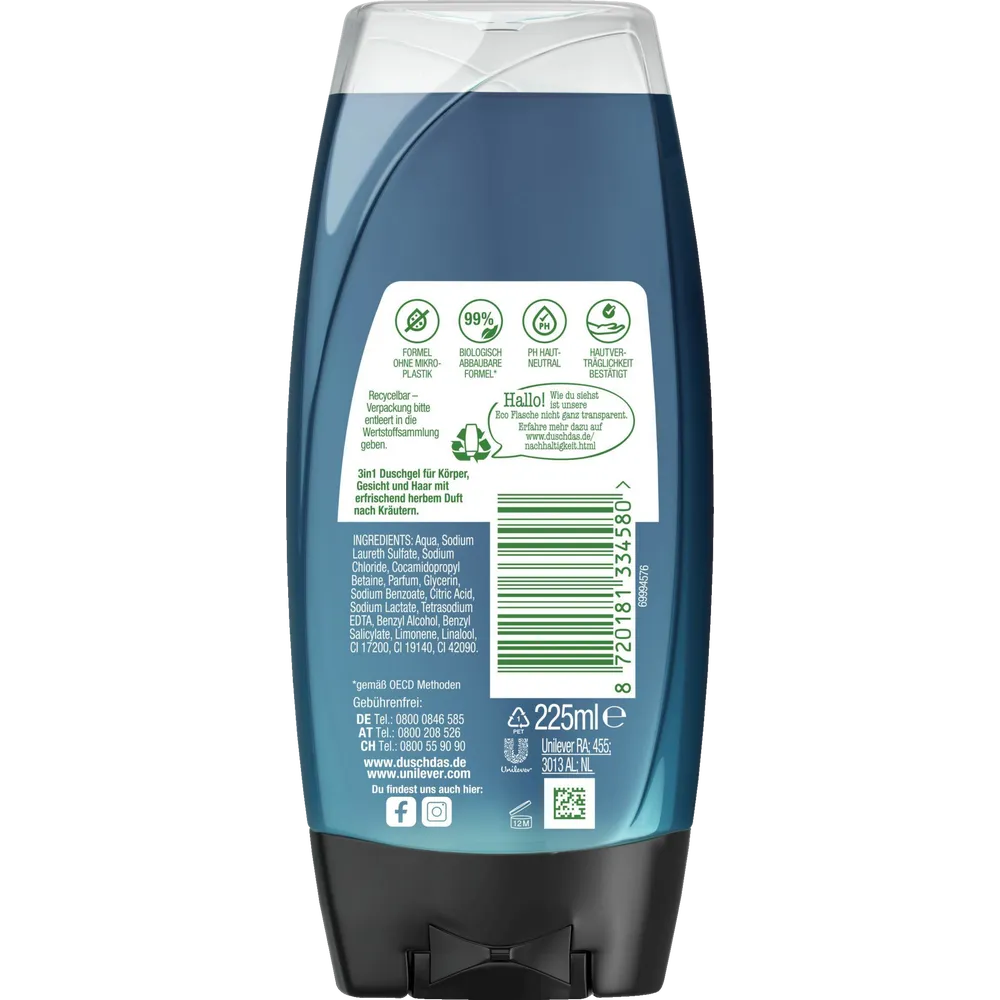 The practical combination as shower gel and shampoo is applicable for body, hair and face. For the ideal shower experience, the refreshing 3-in-1 shower gel is easy to dispense, lathers up quickly on body, hair and face and rinses off easily. It leaves a fresh and clean feeling, is pH skin neutral and therefore particularly gentle to the skin.