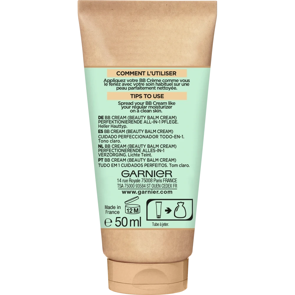 Garnier SkinActive BB Cream Classic Light is a tinting day cream for light skin tones. With the all-in-1 care consisting of day cream, foundation and sun protection, irregularities on the skin are cleverly concealed and spots, redness and dark shadows are covered. Thanks to the moisturizing formula with hyaluronic acid and aloe vera, the skin is hydrated for 24 hours. In addition, mattifying mineral pigments ensure that the complexion appears smoother and more even. The formula with sun protection factor 15 protects the skin from UV rays and at the same time prevents sun-induced skin ageing.