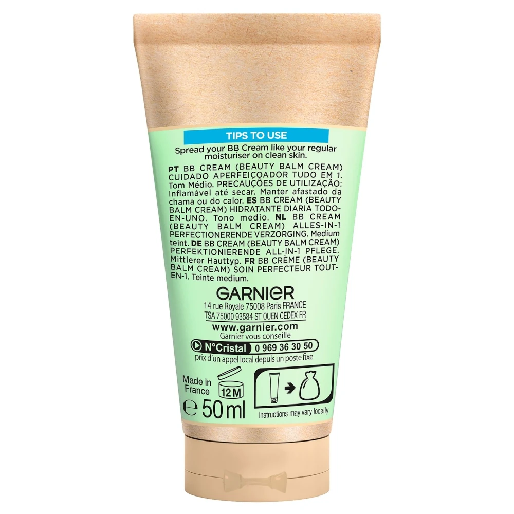 The Garnier SkinActive BB Cream All-in-1 Care for combination and oily skin in the medium shade conceals skin irregularities and gives a radiant complexion without a mask effect. It is suitable for medium skin tones and gives a matte complexion and refined pores.