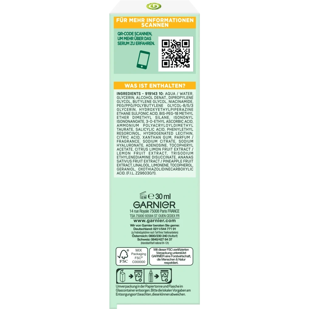 SkinActive Anti-Dark Spots & Brightening Serum with Vitamin C is not only effective, but also part of our greener beauty world. Our formula is based on green science and we use recycled glass for our packaging. With this product you not only contribute to a positive effect for your skin, but also to sustainability.