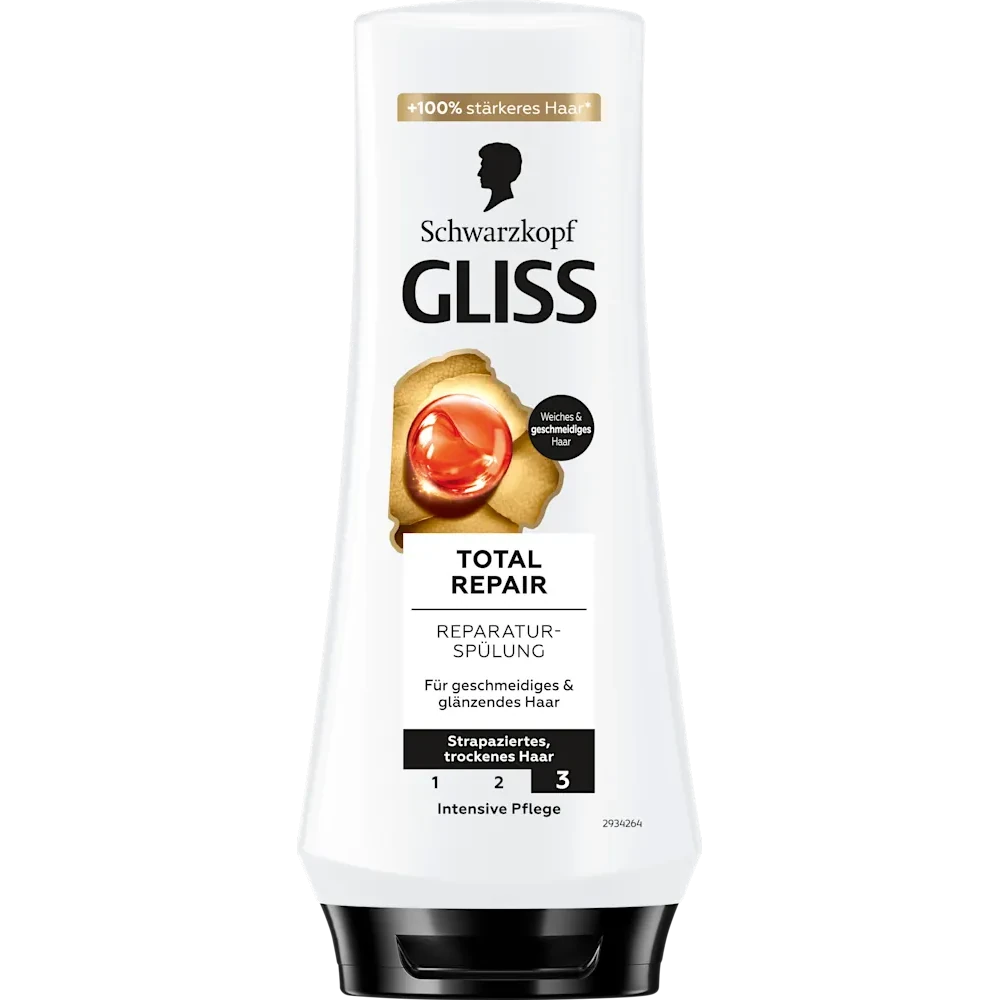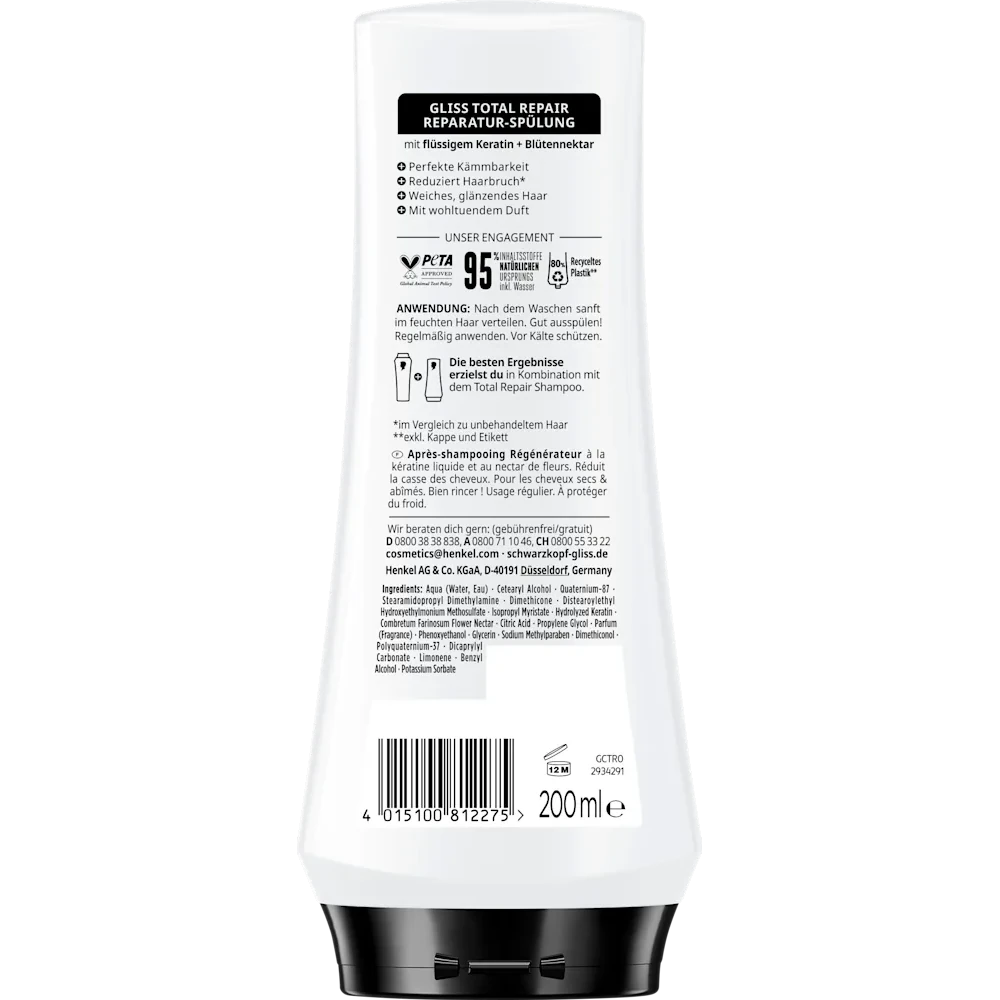 The Schwarzkopf Gliss Total Repair Conditioner provides intensive care for dry, brittle, and damaged hair. With its unique combination of Liquid Keratin and Floral Nectar, this conditioner repairs the inner hair structure while smoothing the outer cuticle, leaving hair supple, soft, and shiny.