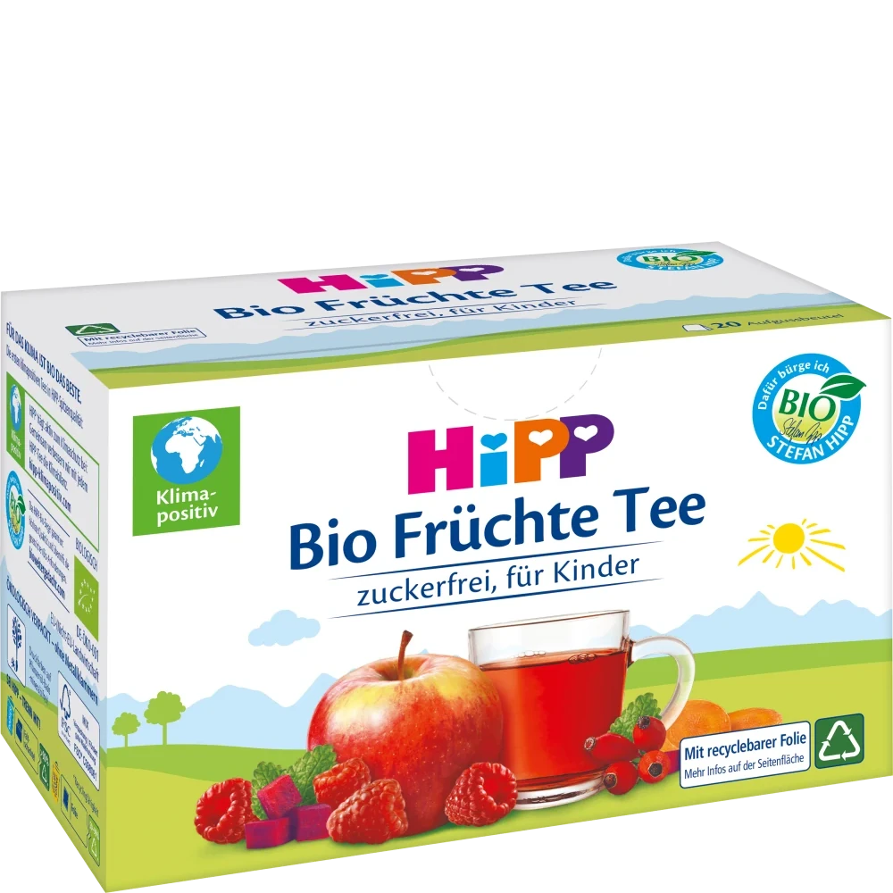 Hipp Organic Fruit Tea is a mild, tasty tea. It consists of organic apples, organic rosehip, fine organic carrot and organic raspberries, which are particularly strictly controlled for harmful substances. Hipp Organic Fruit Tea is naturally mild, contains no added sugar.