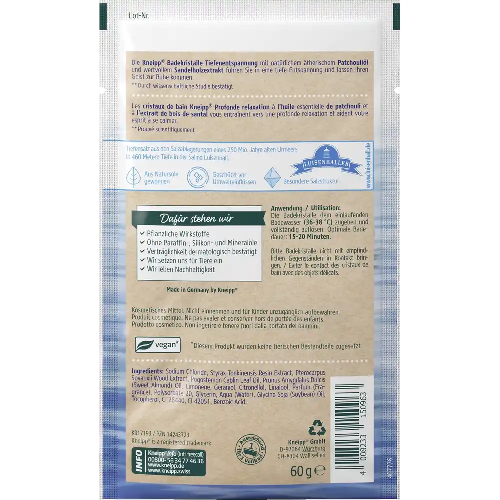 Kneipp Deep Relaxation Bath Crystals with natural patchouli essential oil and precious sandalwood extract will lead you into deep relaxation and let your mind rest.