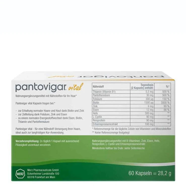 Pantovigar® vital is a vegan dietary supplement designed to support normal hair structure and vitality from within. Its carefully formulated combination of amino acids, B‑vitamins, minerals, and plant extracts provides targeted nutritional support for hair integrity and resilience.
