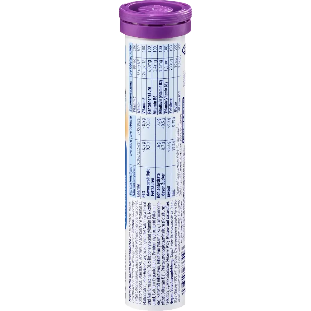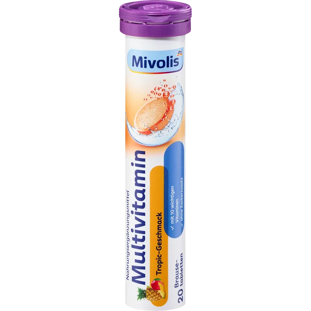 Mivolis Multivitamin Effervescent Tablets with a tropical flavour without added sugar. 20 tablets for a 20-day supply