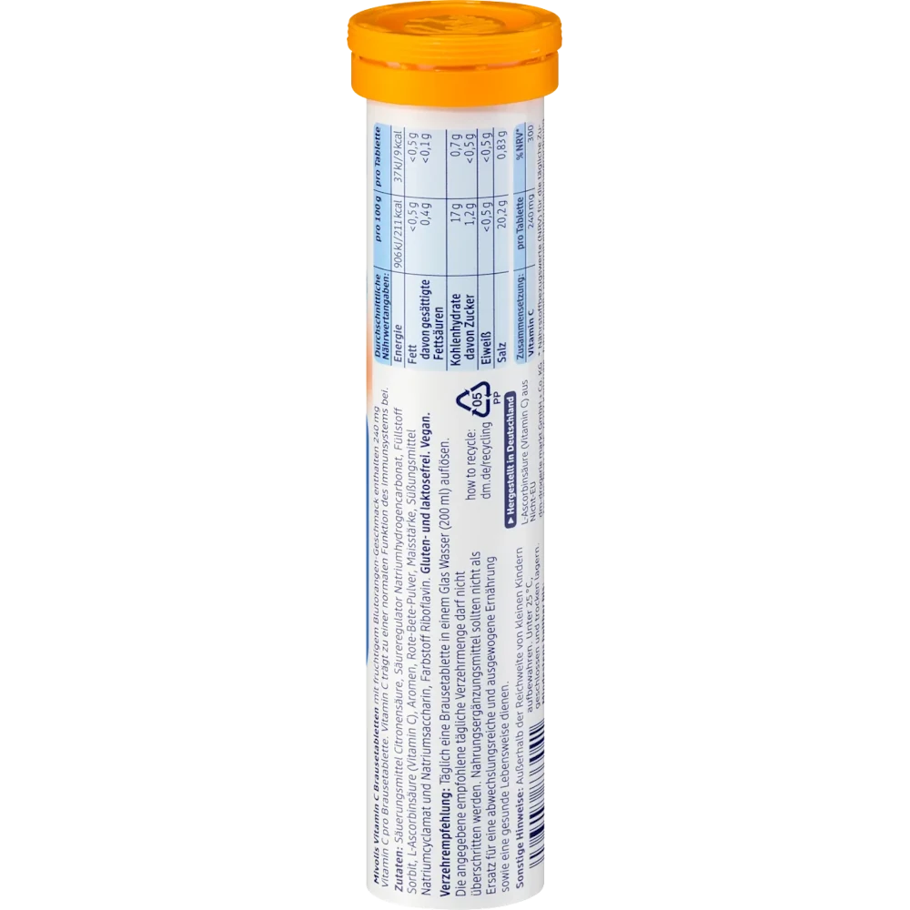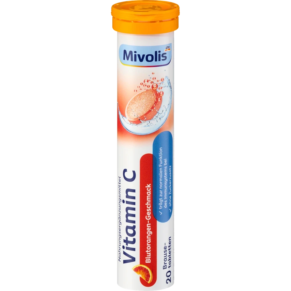 The vitamin C contained in Mivolis vitamin C effervescent tablets supports the normal function of the immune system. In certain life situations or with special eating habits an increased vitamin requirement can develop. 20 tablets for a 20-day supply.