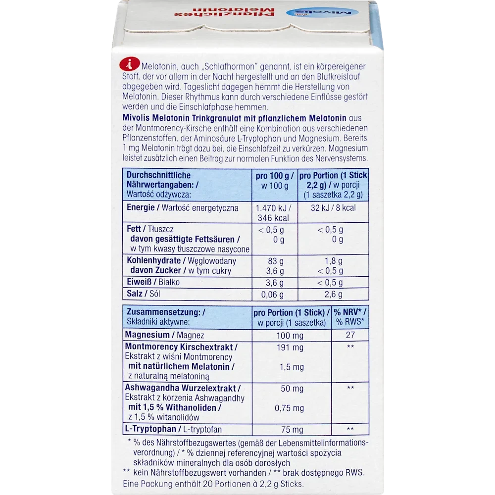 Mivolis Melatonin Drink Granules with plant-based melatonin from Montmorency cherries contain a combination of various plant substances, the amino acid L-tryptophan, and magnesium.