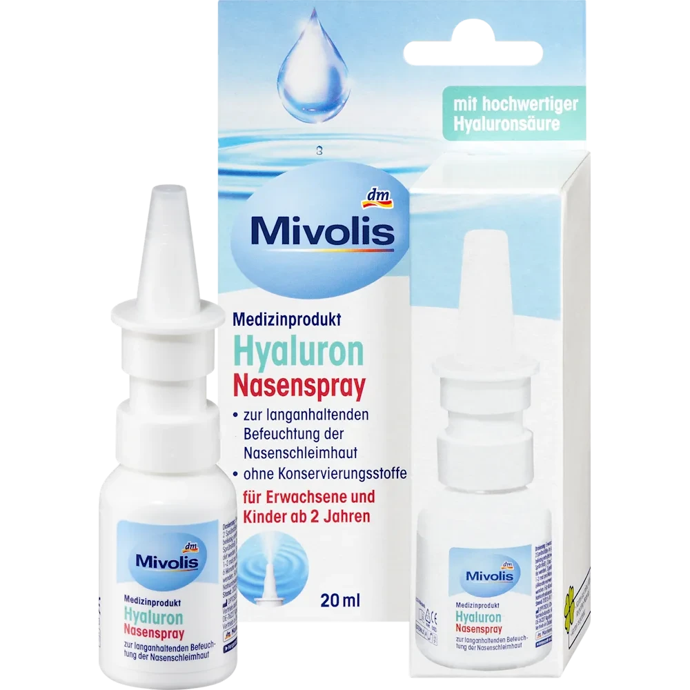 Remove the protective cap. Before using for the first time, hold the bottle with the opening facing upwards and press the pump 1–2 times until a steady spray is produced. Mivolis Hyaluron Nasal Spray is then ready for use. Dosage: Adults and children aged 6 years and older: spray 1 to 2 sprays into each nostril up to 3 times a day. The dose can be increased as needed. Children aged 2–6 years: 1 spray in each nostril twice daily. Hyaluron Nasal Spray can be used over a longer period of time. Insert the spray nozzle into the nostril and press the pump twice per nostril, inhaling gently. Wipe the spray head after each use and replace the protective cap. For hygienic reasons and to prevent the spread of infection, each spray should only be used by one person.