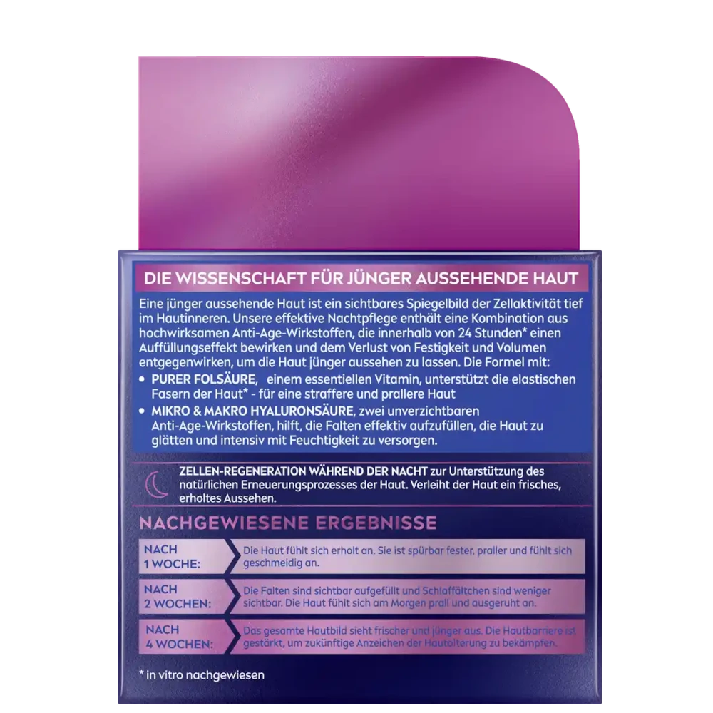 Micro and Macro Hyaluronic Acid, 2 essential anti-age ingredients, help to effectively fill wrinkles, smooth and intensely hydrate the skin. Discover extra cell regeneration during the night to support the skin’s natural renewal process – for a fresh, refreshed look.