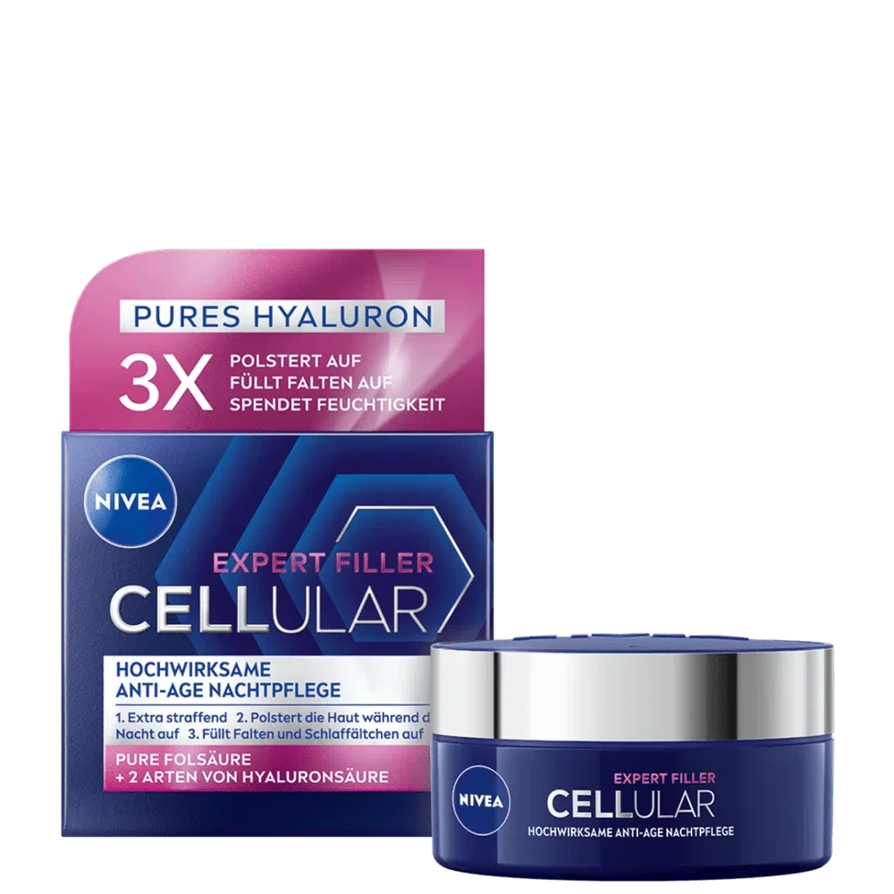 NIVEA Cellular Expert Filler Anti-Age Night Care with its innovative formula contains a combination of highly effective anti-age active ingredients that provide a replenishing effect within 24 h and counteract the loss of firmness and volume to make the skin look younger.