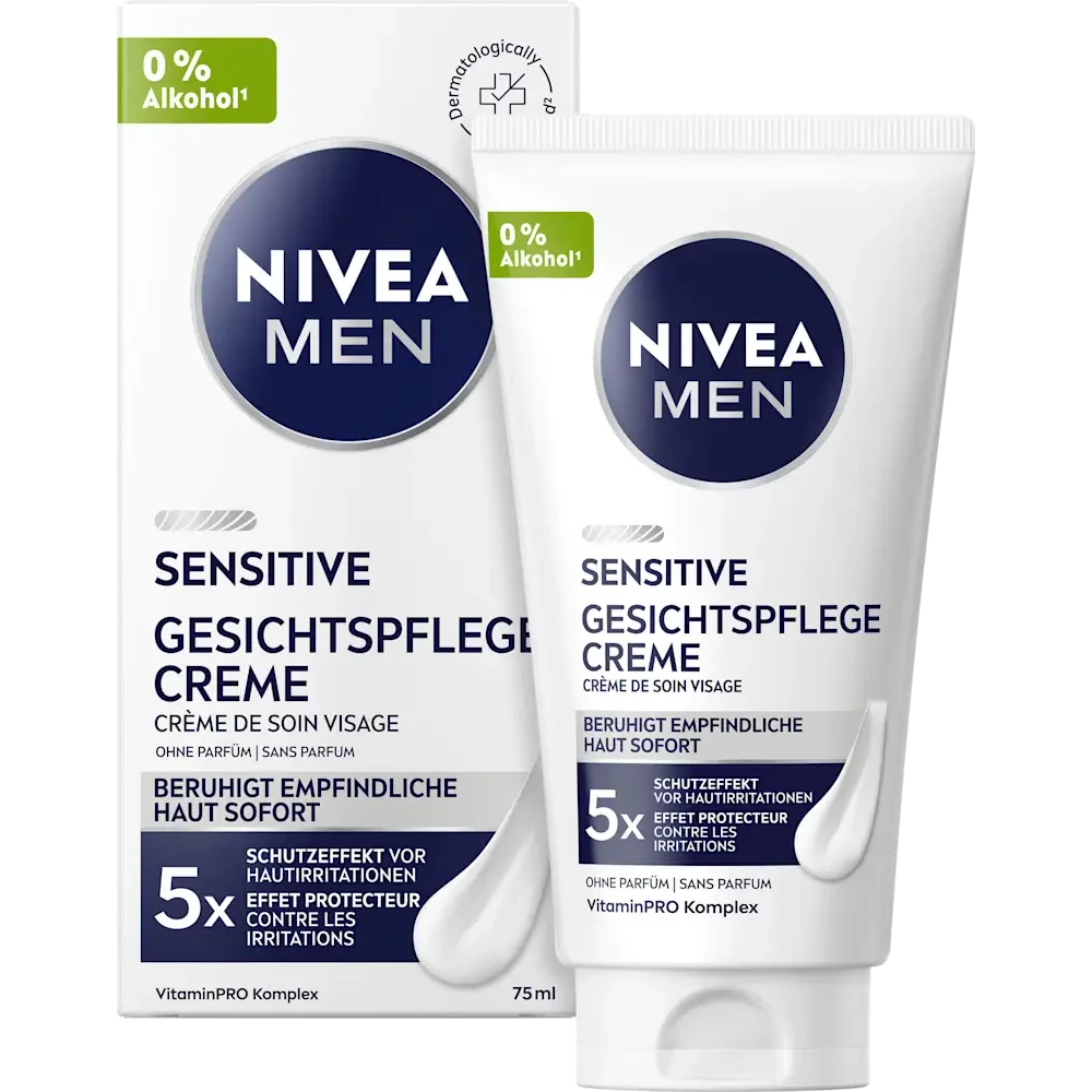 The NIVEA MEN Sensitive Face Cream 75 ml delivers targeted daily care for sensitive and easily irritated skin. Expertly formulated without added fragrance and alcohol (ethyl alcohol), this lightweight moisturiser balances deep hydration with a calming effect that helps soothe redness and discomfort throughout the day. Its non-greasy texture absorbs quickly, leaving the skin feeling refreshed and comfortable without stickiness.