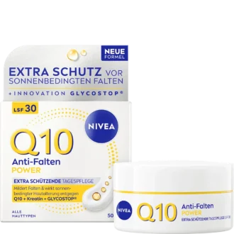 Nivea Q10 Anti-Wrinkle Power Firming Day Care replenishes the skin’s energy reserves thanks to the improved double-effect formula.