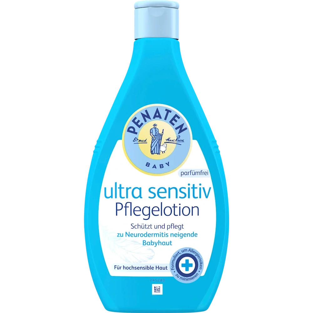 Penaten Ultra Sensitive Care Lotion protects and cares for even highly sensitive baby skin. It has been formulated to minimize the risk of allergies – without perfume or colorants. The lotion also increases the skin’s moisture content.