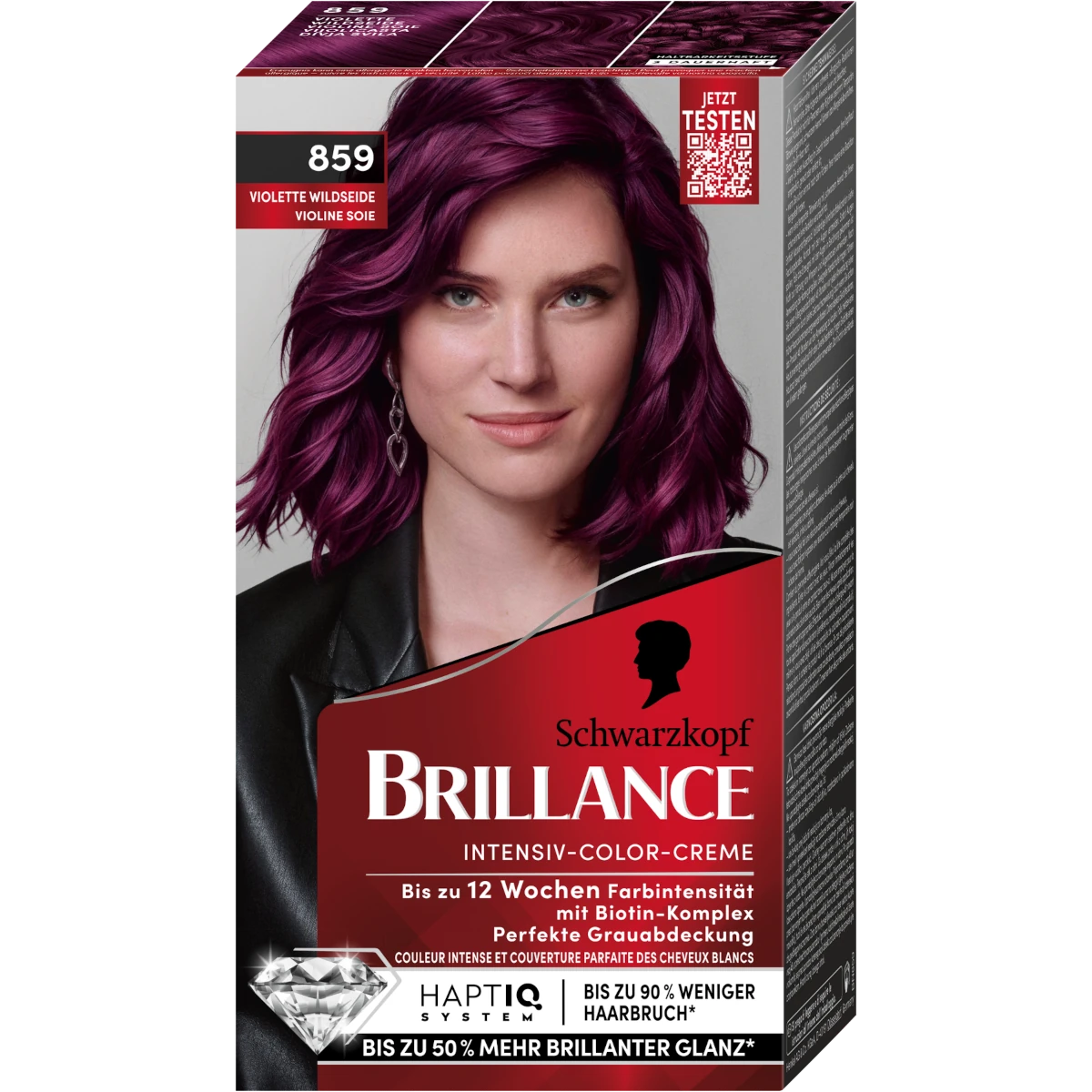 The creamy color formula penetrates deeply into the hair structure to create a vibrant violet tone with luminous shine and reliable 100 % gray coverage. After coloring, the included Diamond Gloss conditioner with HaptIQ System strengthens the hair fiber by creating new micro-connections and helps reduce hair breakage while sealing the color pigments for long-lasting brilliance.