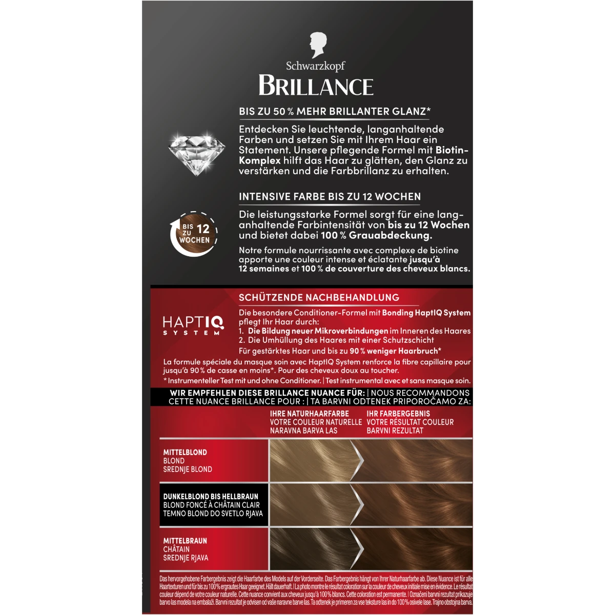 The creamy color formula penetrates deeply into the hair structure to create a warm brown shade with luminous shine and reliable 100 % gray coverage. After coloring, the included Diamond Gloss conditioner with HaptIQ System strengthens the hair fiber by creating new micro-connections and helps reduce hair breakage while sealing the color pigments for long-lasting brilliance.