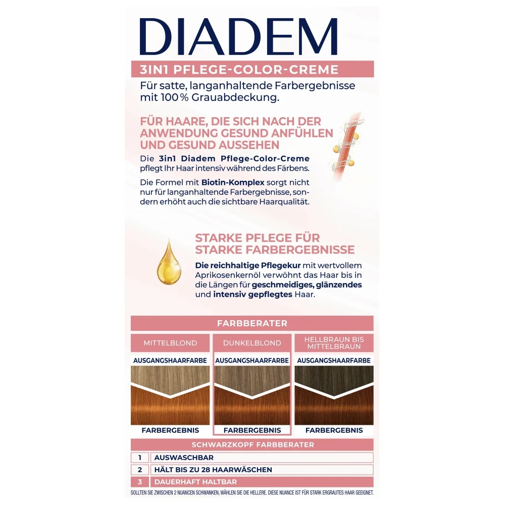 The 3 in 1 DIADEM Care Color Cream intensively cares for your hair during coloring. The formula with biotin complex not only ensures long-lasting color results, but also increases the visible hair quality. The rich after-treatment with valuable apricot kernel oil pampers the lengths after coloring, makes the hair supple, shiny and intensively nourishes it.