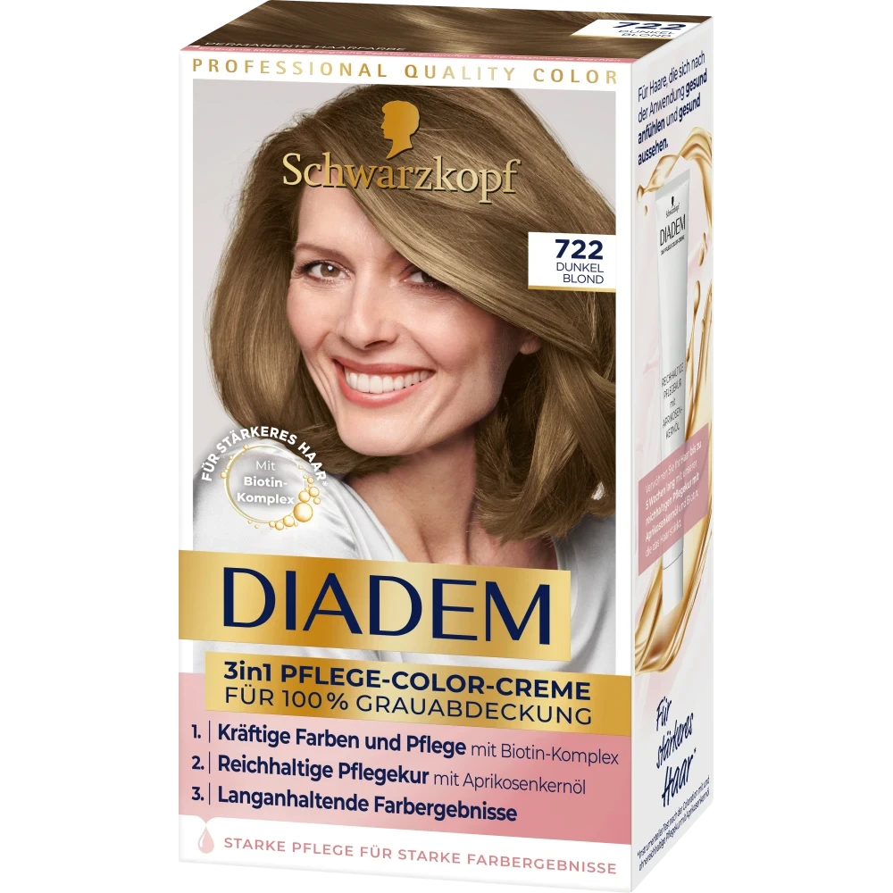 SCHWARZKOPF DIADEM 3 in 1 Care Color Cream 722 Dark Blond – For rich, long-lasting color results. With apricot kernel oil & biotin complex. For hair that looks and feels healthy after application, for 100% gray coverage.