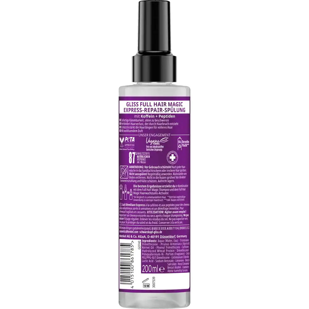 Gliss Full Hair Magic Express-Repair Conditioner is designed with clean-beauty values in mind. It features a vegan formula, is PETA-approved under Schwarzkopf’s global animal test policy, and contains around 87 % ingredients of natural origin (including water). The bottle body is made from 100 % recycled plastic (excluding cap and label), reflecting Schwarzkopf’s commitment to sustainability.