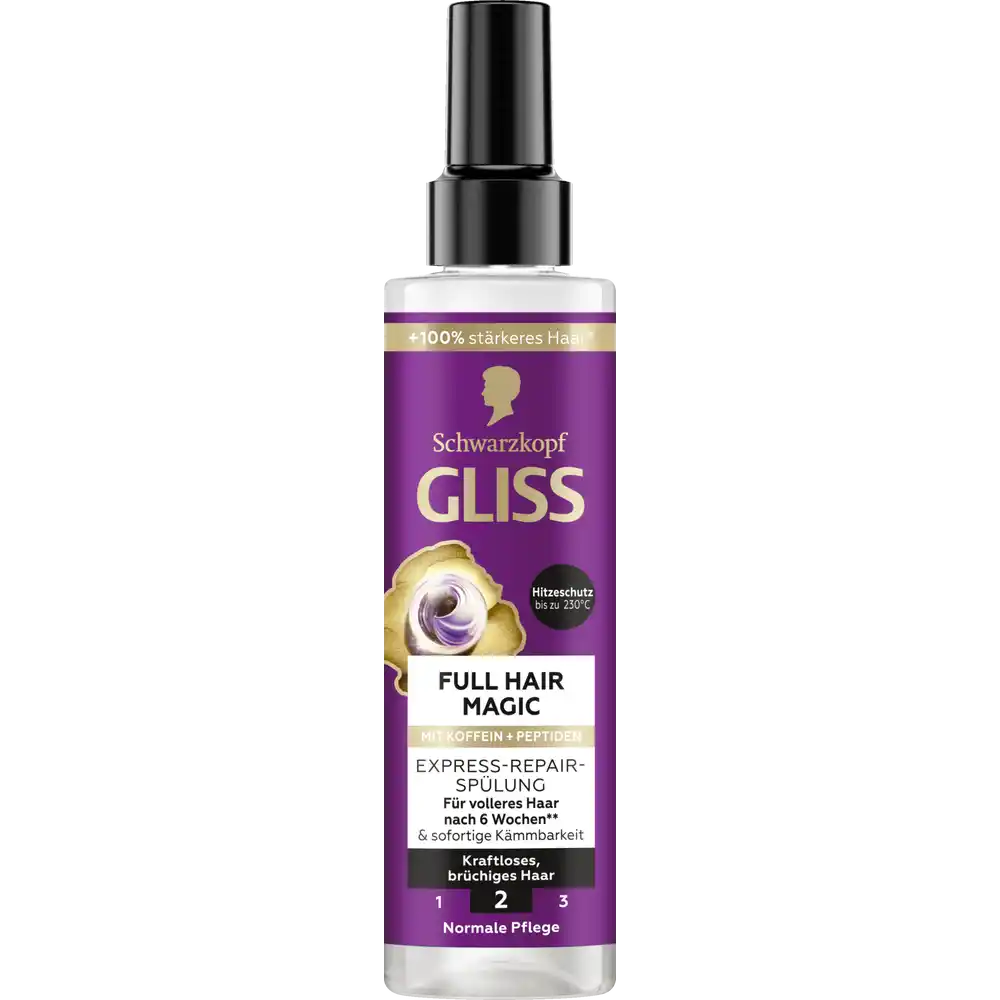 Discover the Schwarzkopf Gliss Full Hair Magic Express-Repair Conditioner, your instant solution for fuller, healthier-looking hair. This leave-in spray is powered by caffeine and hydrolyzed wheat protein to strengthen hair lengths, reduce breakage, and help prevent hair loss caused by weakened strands. With every spray, your hair feels fortified, more resilient, and magically full.
